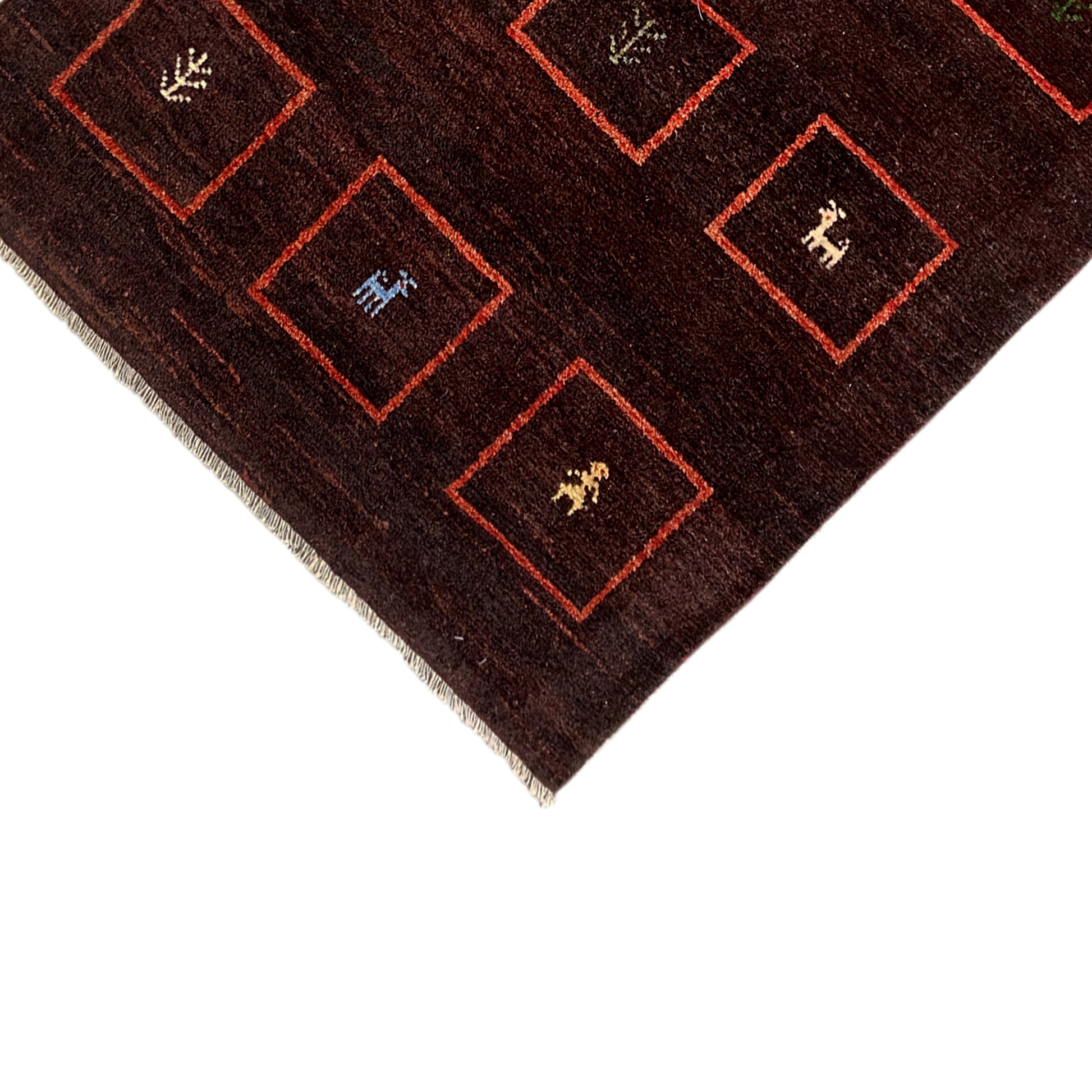 この表現豊かな手織りのGabbehラグは、サイズ147x99cmで、手紡ぎの植物染めウールで作られており、深いブラウンを基調としています。伝統的な格子模様の赤い各マスには、物語を語る独特で様式化された動物や人物のモチーフが描かれています。このラグは、本物の温かみと素朴でトライバルな魅力をあらゆる家庭にもたらし、長持ちする一点物です。
