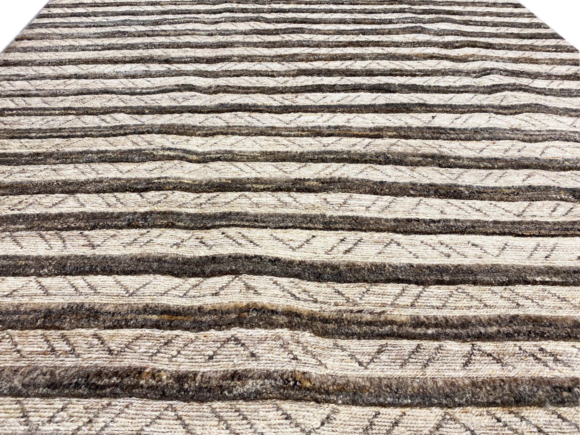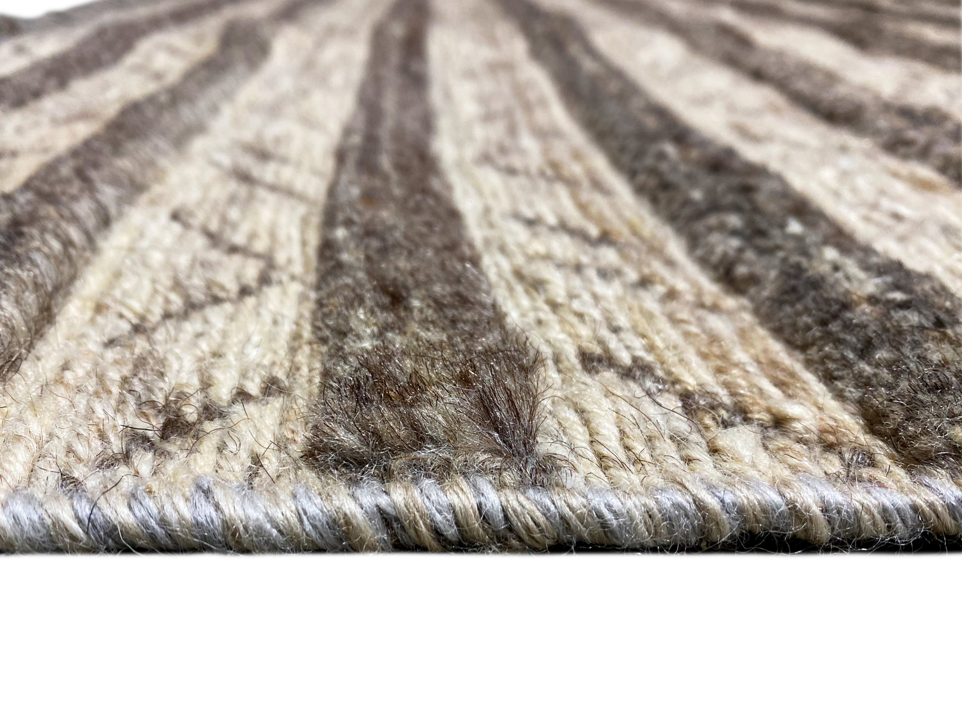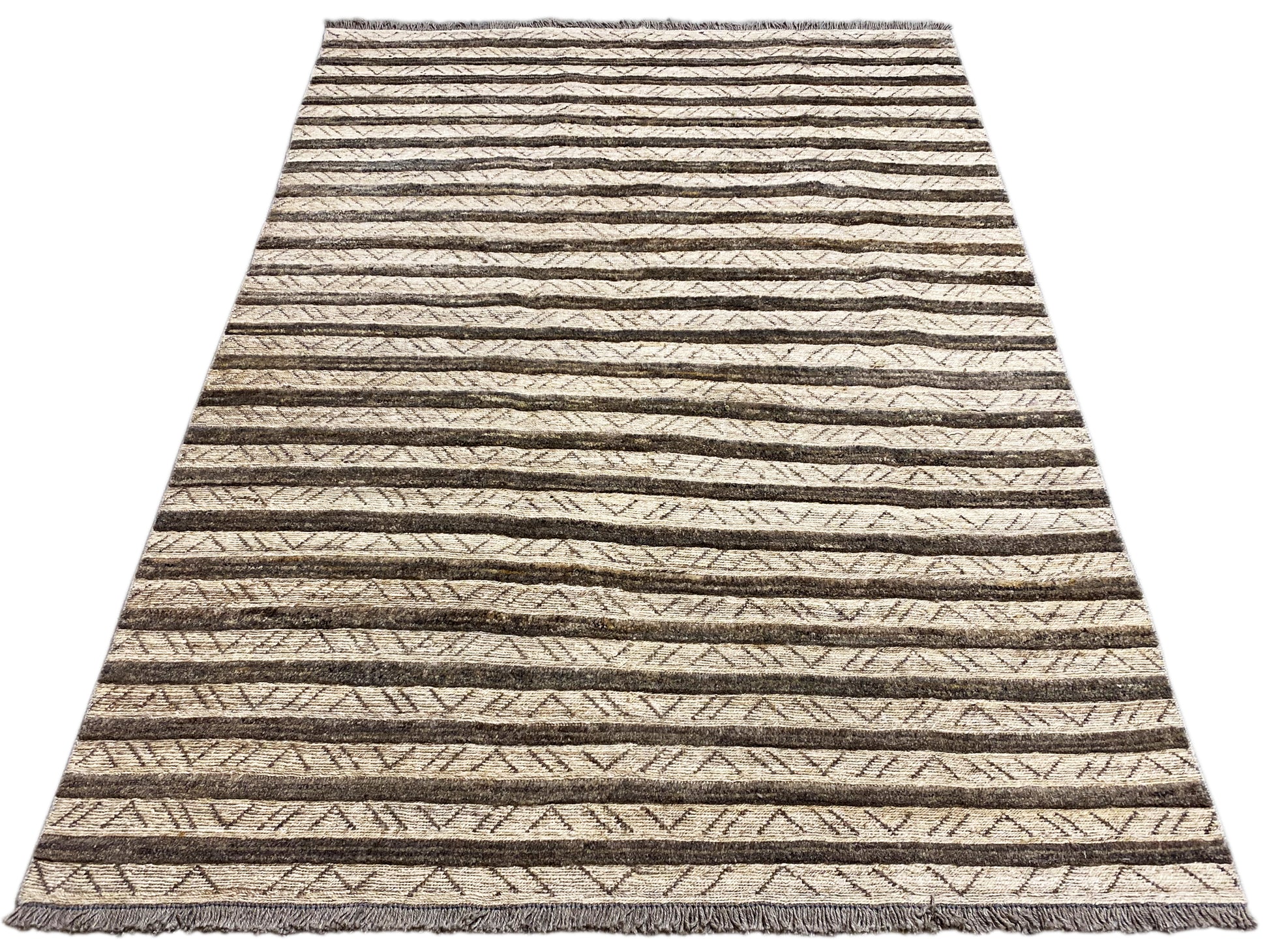 この手織りのケリム・ガベ絨毯は、100%手紡ぎの羊毛で作られており、自然なエレガンスとベージュとブラウンの繊細な幾何学的ストライプ模様が融合しています。サイズは190x140cmで、リビングやダイニングエリアに最適で、モダン、スカンジナビアン、ボヘミアン風のインテリアスタイルに完璧にマッチします。控えめなトライバル模様が絨毯に個性と奥行きを与え、高品質な羊毛は耐久性と長持ち、そして心地よい柔らかさを提供し、スタイリッシュで快適な居住空間にぴったりです。