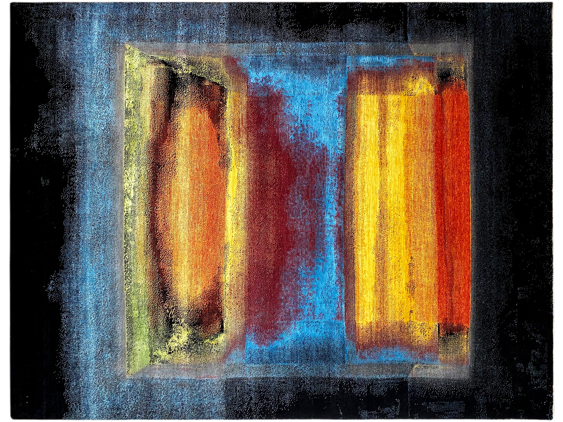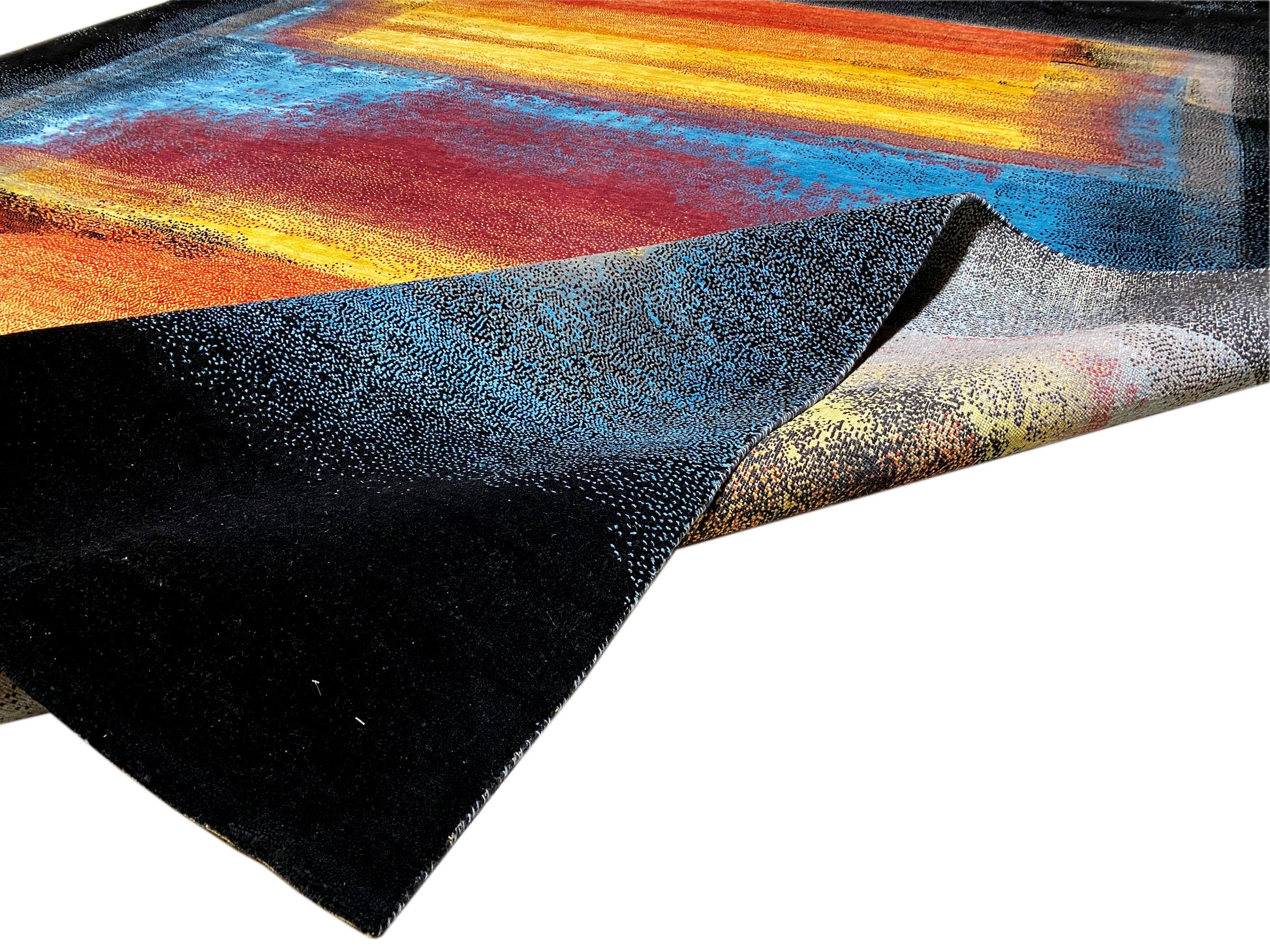 この手織りのデザイナーカーペットは、高級ウールとサリーシルクで作られており、印象的な色彩の組み合わせとモダンなアート風デザインが特徴です。深い黒と赤、黄、青の鮮やかなグラデーションの組み合わせが、どんな部屋にも独特で贅沢な雰囲気を与え、現代的で芸術的なインテリアスタイルに理想的にマッチします。抽象的な模様は絵画を思わせ、このカーペットを本物のステートメントピースにしています。364×275cmのゆったりとしたサイズで、大きなリビングスペースに最適で、視覚的なエレガンスだけでなく、高い快適さと耐久性も提供します。