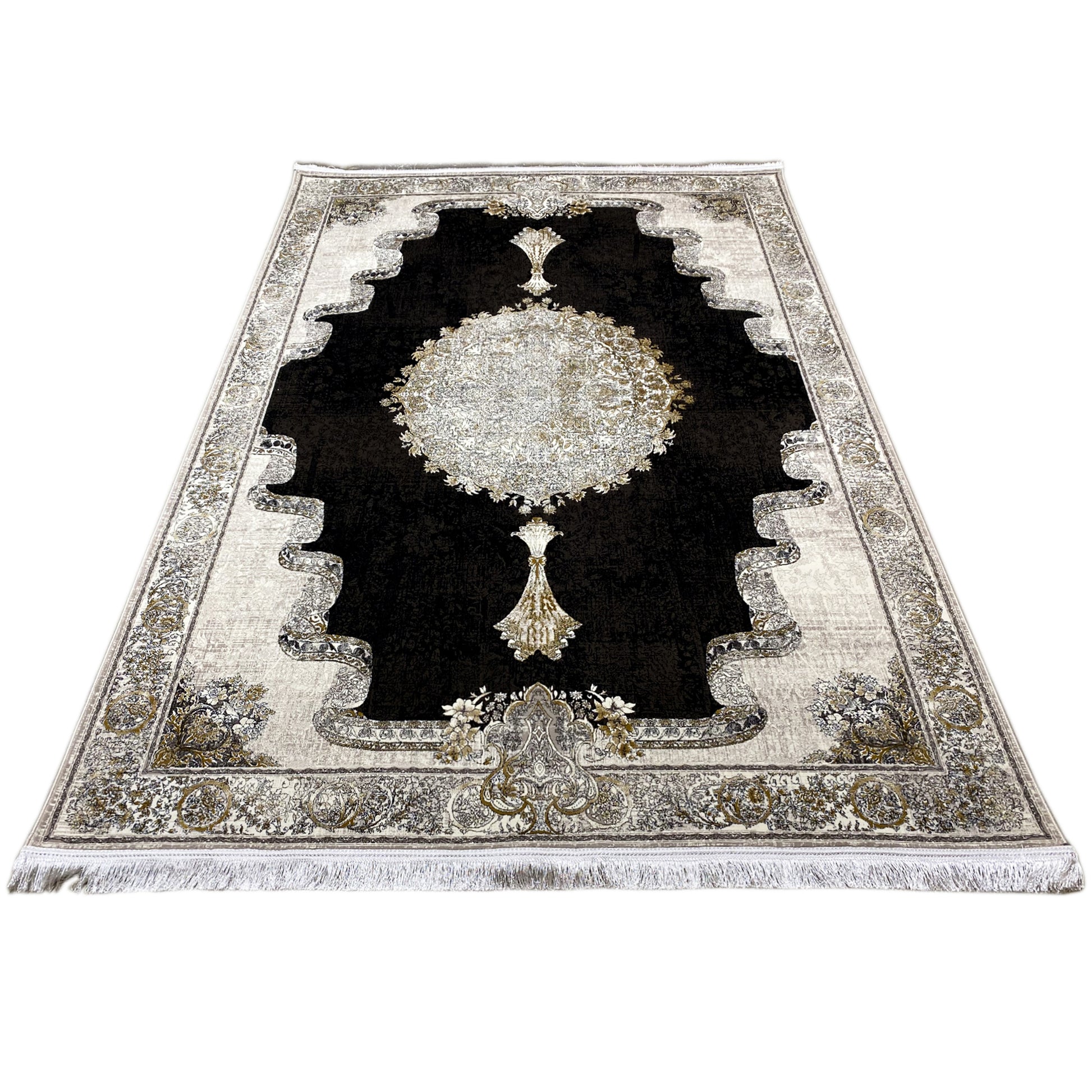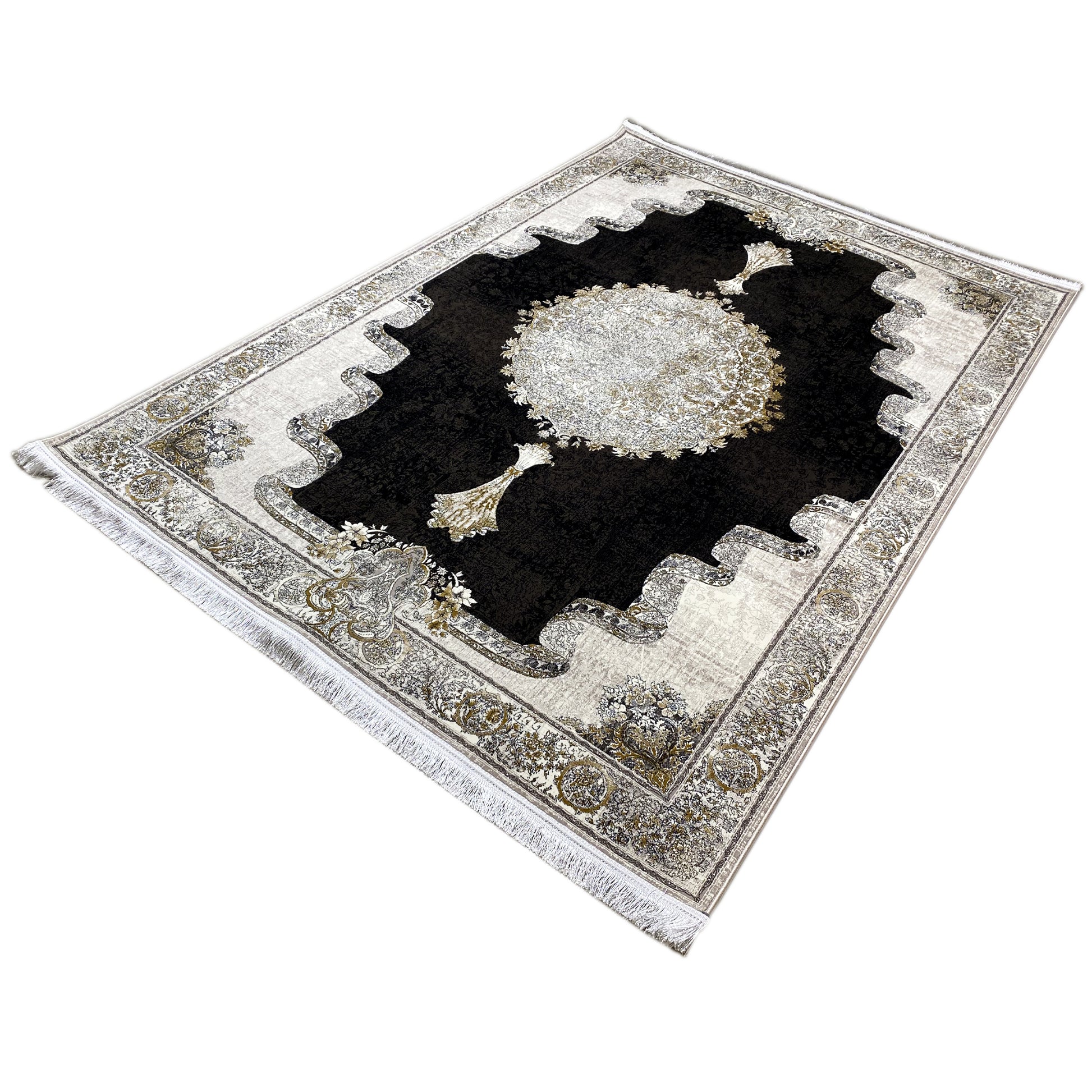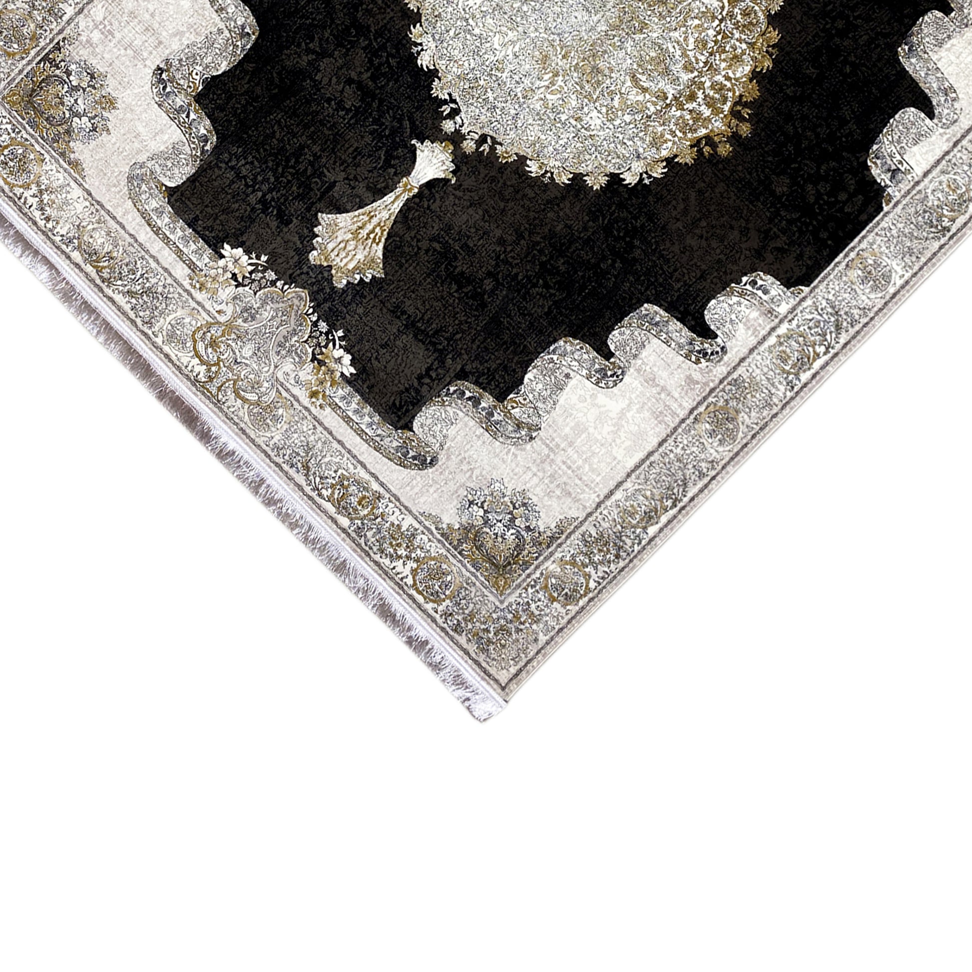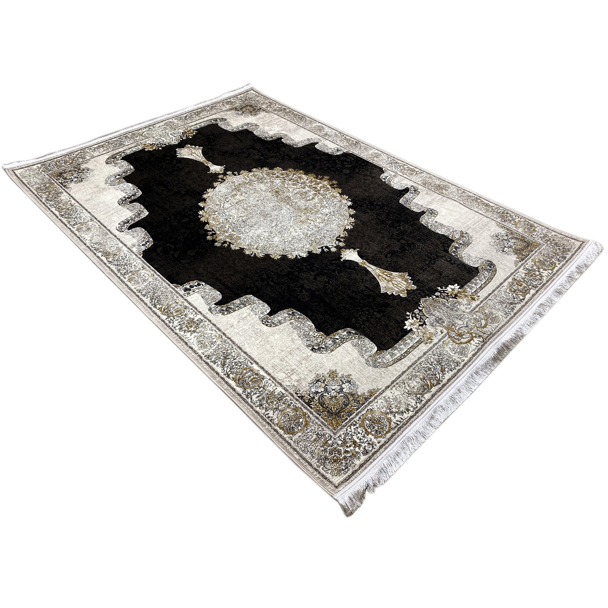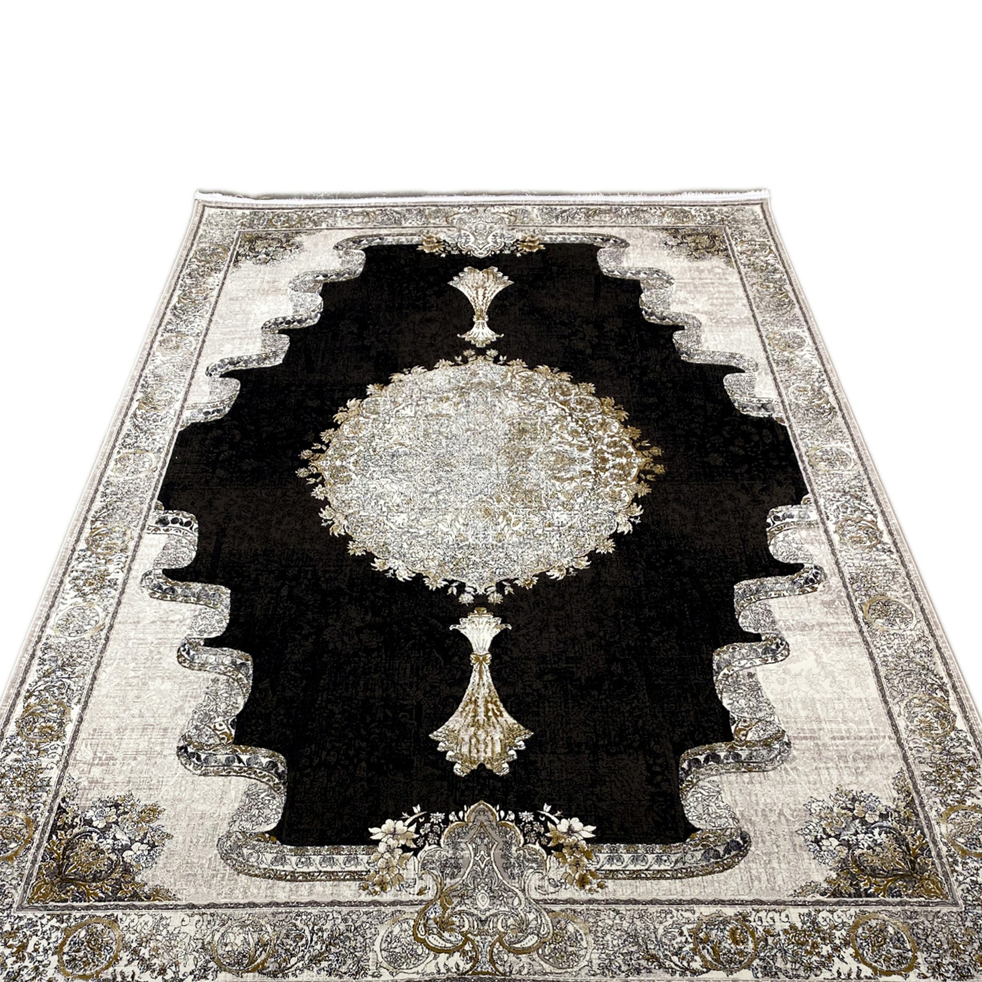 この美しいクラシックなカーペットで、ご自宅にドラマチックなエレガンスのひとときを演出しましょう。スモークグレーの印象的なダークな中央部分は、明るいクリーム色の縁取りと中央の細部までこだわったメダリオンと見事なコントラストを成しています。独特の縁取り模様がさらに贅沢なアクセントを加えています。100%耐熱加工アクリル製で、この柔らかく耐久性のあるカーペットは、豪華なスタイルと現代的な耐久性を兼ね備え、頻繁に使用されるエリアに最適です。170x240cmのゆったりとしたサイズは、リビングルームや寝室にエレガントなアクセントを加えるのに理想的です。"}