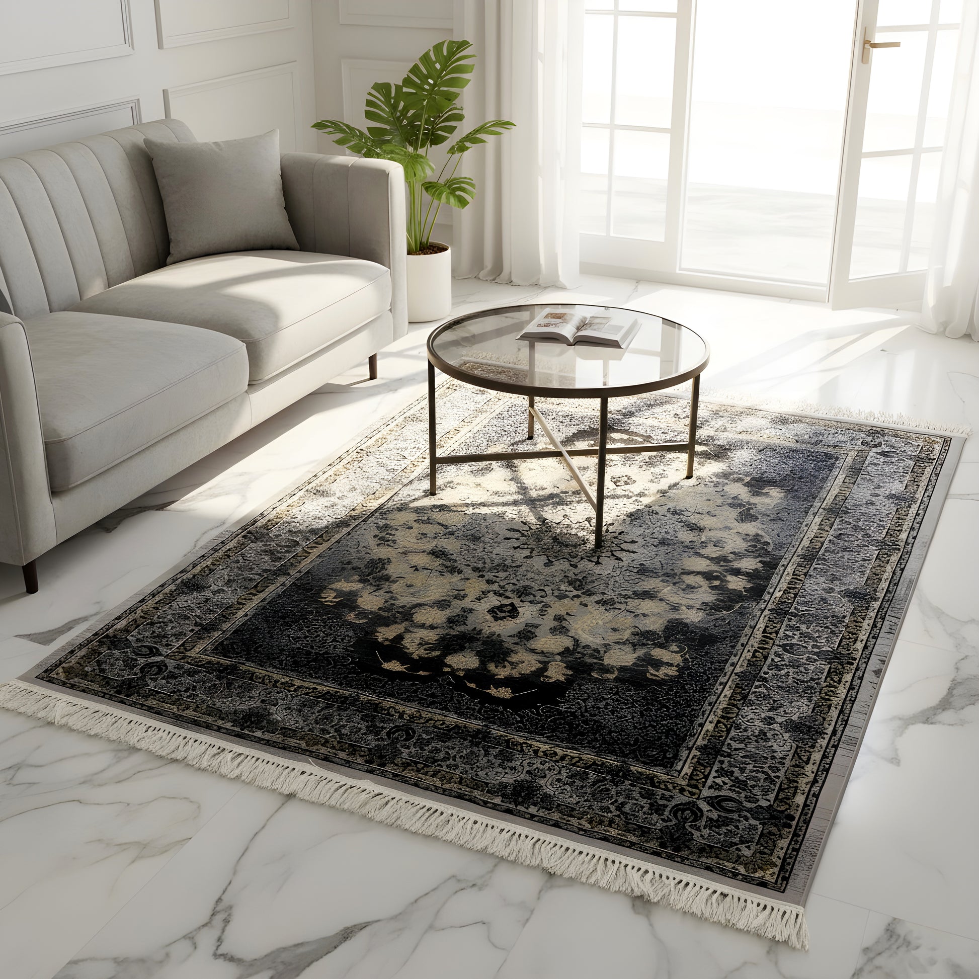 この印象的な機械織りの160x230cmサイズのカーペットは、モダンでクラシックなリビングスペースにスタイリッシュなアクセントを加えます。耐久性のあるポリプロピレン製のパイル素材は長持ちし、お手入れも簡単で、頻繁に使用されるエリアに最適です。カーペットはエレガントなダークグレーとアンスラサイトの色調で、中央に金色とベージュのメダリオンを配した芸術的でオリエンタルにインスパイアされたパターンを描いています。この洗練されたクラシックデザインはグラマーファクターを備え、印象的でありながら贅沢な雰囲気を演出します。このカーペットでリビングルームやダイニングルームに深みのあるエレガンスを加えましょう。