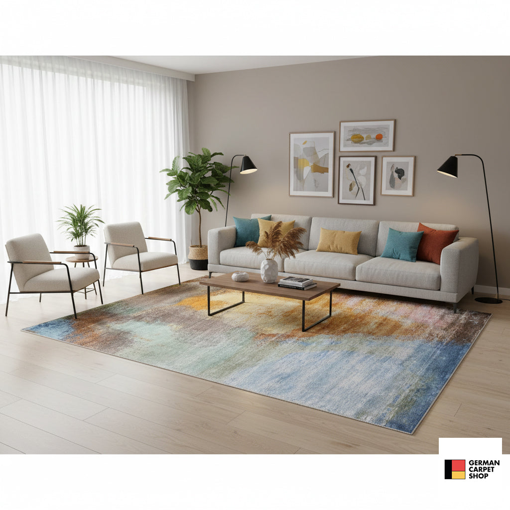 この手織りのモダンなラグは、手紡ぎのウールとビスコースの高品質な混紡素材から作られた真の芸術作品です。ラグは抽象的なパターンと、青、金、ローズ、茶色の鮮やかなカラーパレットが特徴で、まるで表現主義の絵画のように見えます。312x209 cmの大きなサイズで、大きなリビングやダイニングエリアの完璧なアクセントとなります。ビスコースの割合が柔らかな光沢を生み出し、色彩をより鮮やかに見せ、どの部屋にも独特の雰囲気を与えます。