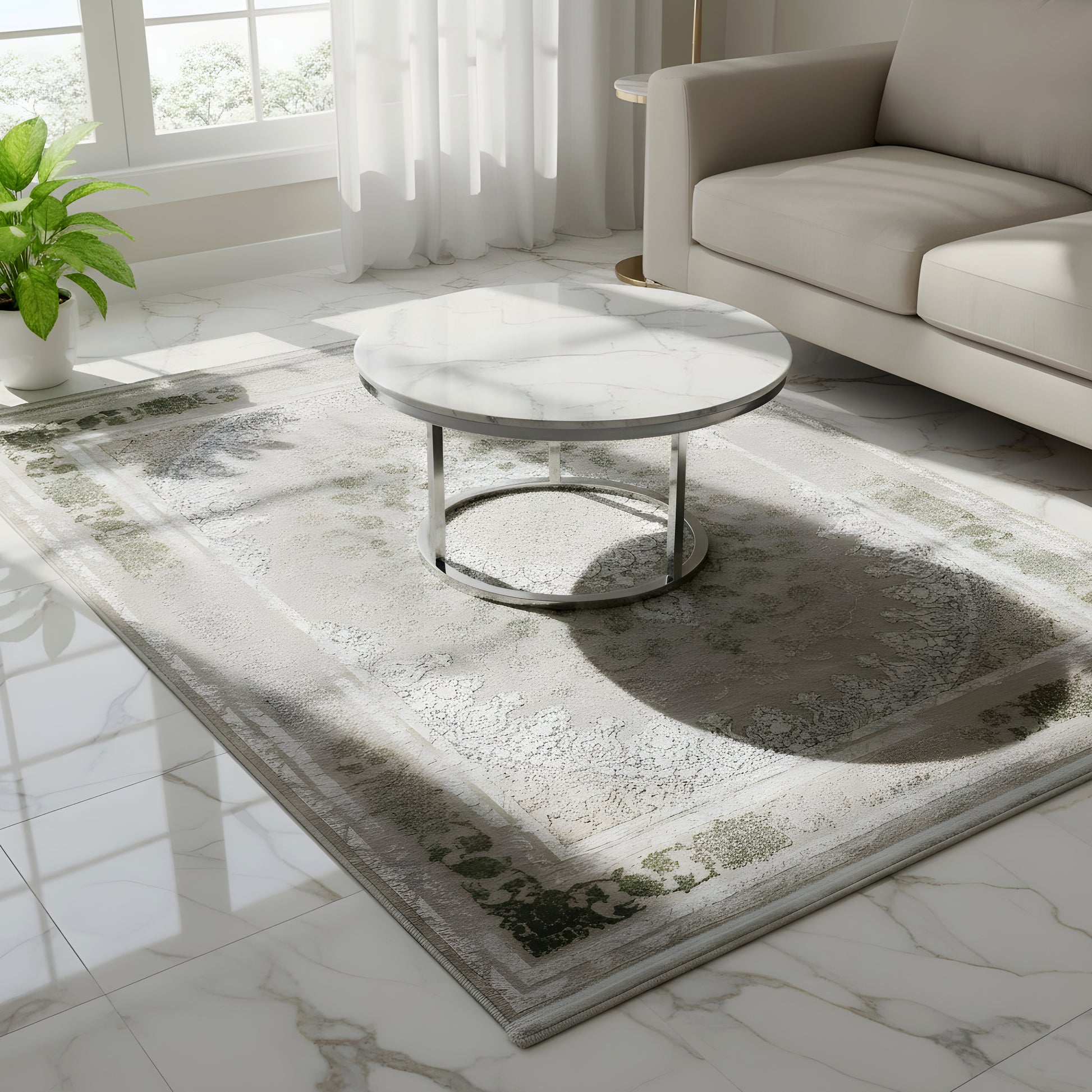 この美しいクラシックなカーペットで、ご自宅に豪華で時代を超えた雰囲気を演出しましょう。特徴的な中央のメダリオンと、輝く銀色と緑色の細やかな模様が、煙のように淡く色あせた背景からエレガントに際立ちます。100%熱処理アクリル製で、この柔らかく耐久性のあるカーペットは、頻繁に使用されるエリアに最適です。170x240cmのゆったりとしたサイズは、リビングルームやダイニングルームにスタイリッシュなアクセントを加えるのに理想的です。