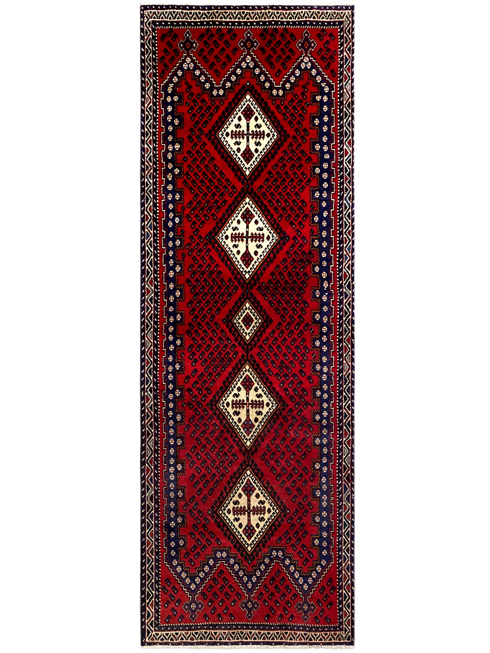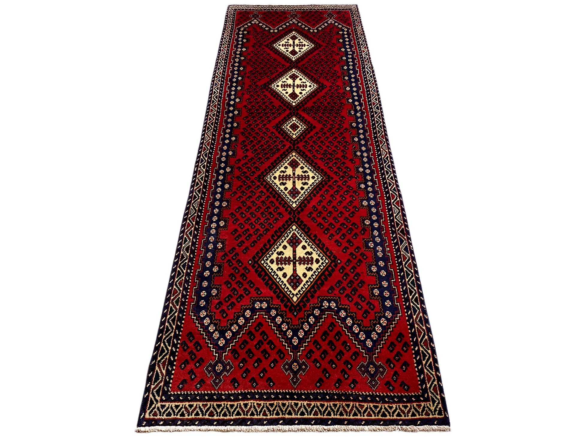 この手織りのシルジャンランナーカーペットは、深い赤色を基調とした伝統的な幾何学模様を特徴とし、クリーム色、青色、黒色のディテールがアクセントになっています。模様は縦軸に沿って配置された一連の様式化された菱形で構成され、花柄や幾何学的要素をあしらった細部まで凝った縁取りで囲まれています。高品質の手紡ぎウールを使用し、植物染料で染められたこのカーペットは、鮮やかな色彩と魅力的なデザインだけでなく、自然な質感と耐久性も兼ね備えています。サイズは282×89cmで、廊下や玄関、その他の狭い空間をスタイリッシュに演出し、オリエンタルな優雅さを添えるのに最適です。クラシックな模様は伝統的、素朴、または折衷的なインテリアスタイルに見事に調和し、温かく迎え入れる雰囲気を作り出します。このカーペットは高品質な床材であるだけでなく、伝統的なペルシャの結び目技術と自然の美しさの証でもあります。