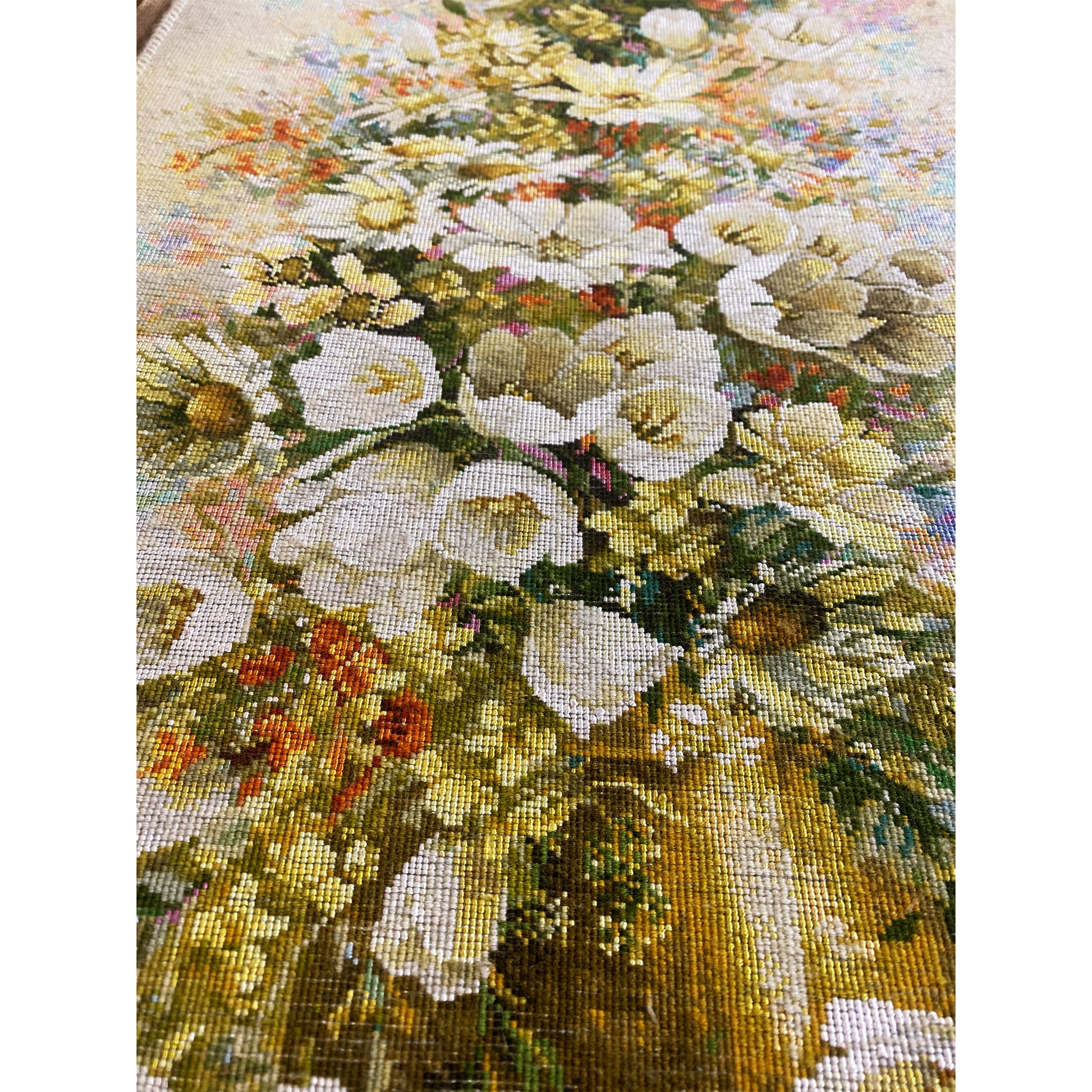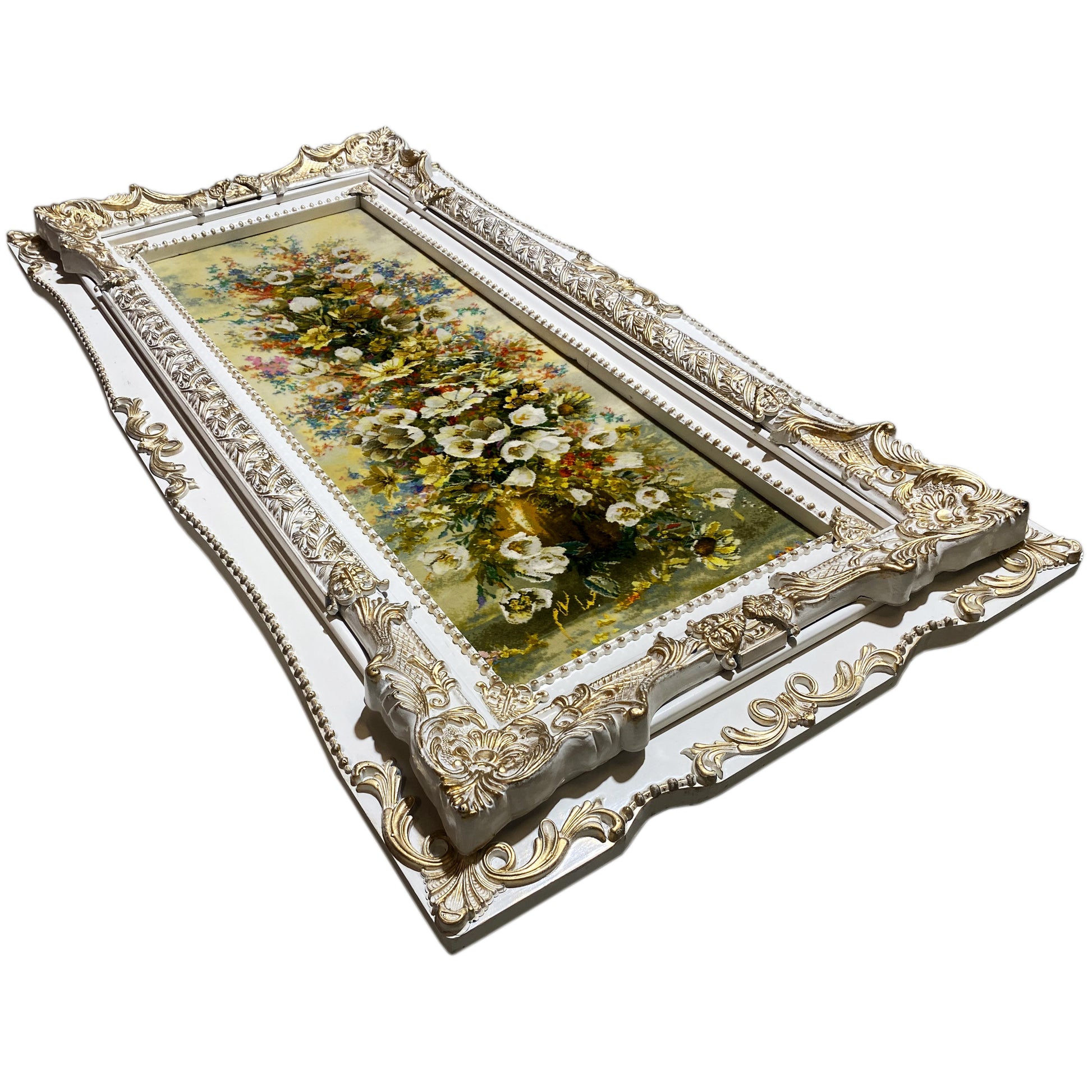 このユニークな手織りの絵画タペストリーは、サイズ98x37cmで、上質なウールとシルクの混紡素材で作られています。鮮やかな色彩で描かれた詳細な人物を含む花のモチーフが、エレガントな静物画のように配置されています。装飾的でクラシックなスタイルの額縁に収められ、この絵画タペストリーは、どんなインテリアにも芸術的で新鮮な雰囲気を与える印象的な壁飾りとして役立ちます。
