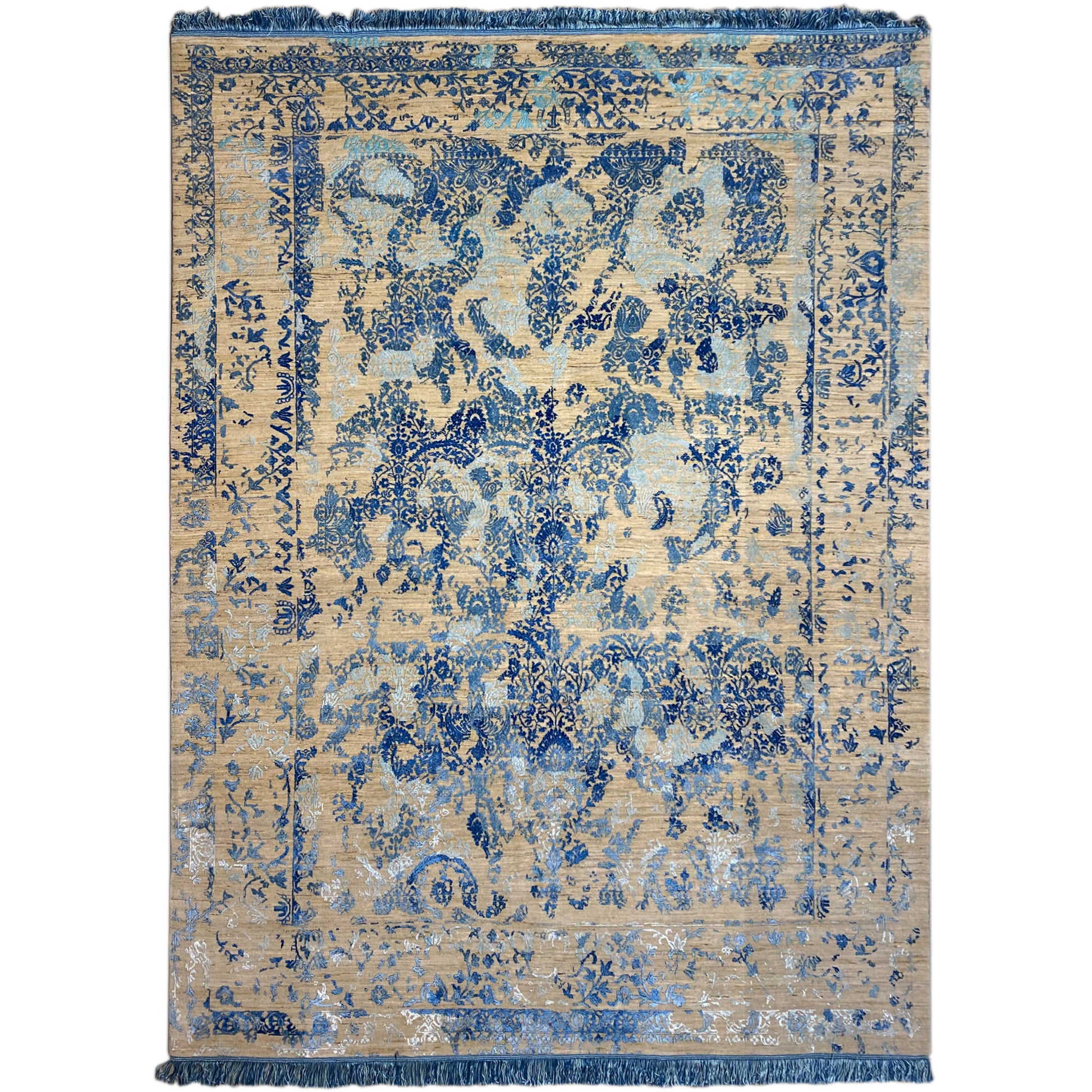 この手織りのデザイナーカーペットでお部屋にスタイルをプラスしましょう。高級感あふれるブルーの色調で、サイズは308x255 cmです。ウールとビスコースの高品質な混紡素材で作られており、クラシックな花柄のデザインが特徴です。クラシックからモダンなインテリアスタイルにぴったり。リビングルームやラウンジに最適で、このカーペットは空間に構造感、温かみ、そしてエレガンスをもたらします。柔らかなパイルは快適な歩行感を提供し、細部までこだわったデザインが注目を集めます。