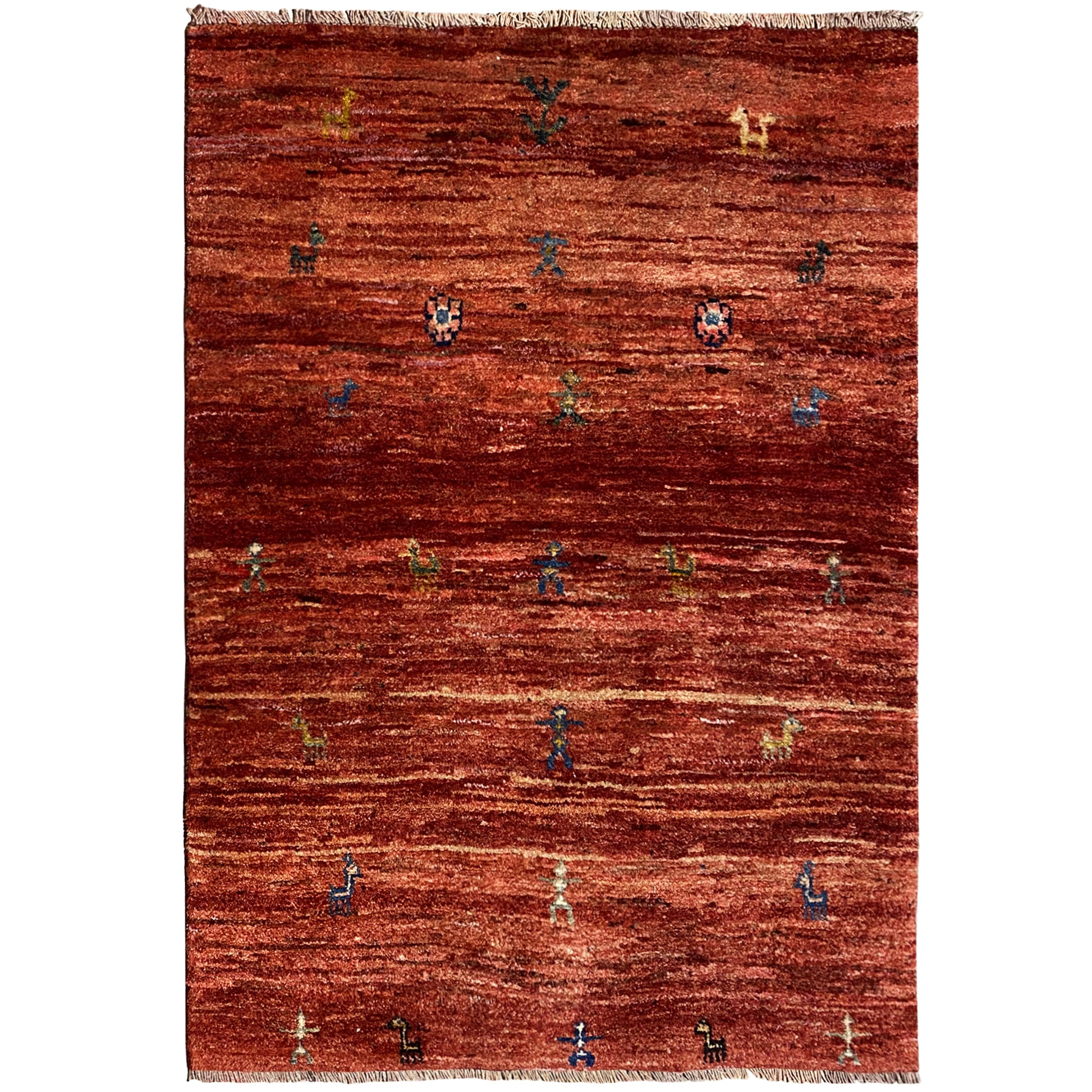 この表現豊かで手織りのGabbehラグ(サイズ140x93cm)は、手紡ぎの植物染めウールで作られています。深紅のフィールドは、多彩な色彩の小さく遊び心のある動物や人物のモチーフで彩られ、伝統的な物語を語っています。このユニークなラグは、素朴なスタイル、トライバルスタイル、または折衷的なスタイルのいずれの空間にも温かく本格的な雰囲気を与え、床のための真の芸術作品です。