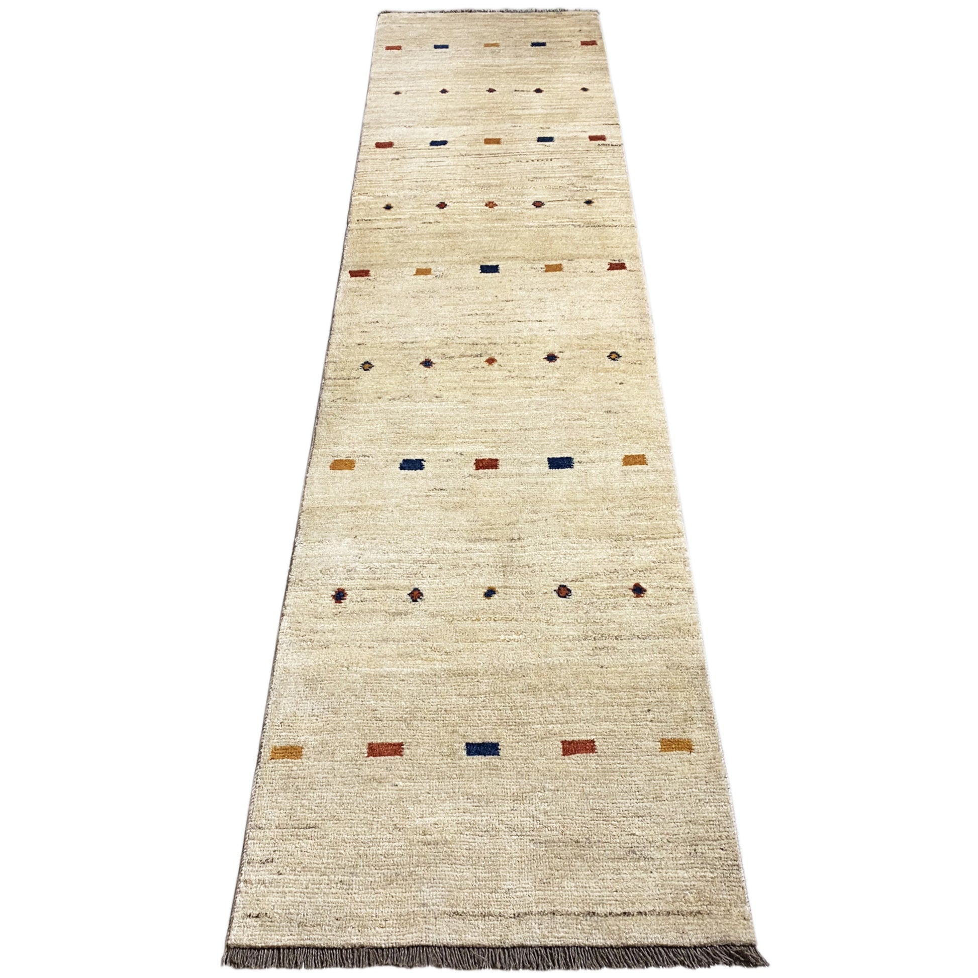 この印象的な、 手紡ぎの糸から作られた、手織りのガベランナーで、ゆったりとしたサイズ279x69cmです。 植物染めのウールで作られています。 ベージュの地に控えめなミニマルデザインが施され、 小さな点や水平のモチーフというカラフルなアクセントで生き生きとしています。 長い廊下やミニマリストなインテリアスタイルに最適で、 このランナーは、落ち着いた優雅さと自然な温かみをお部屋にもたらします、 同時にそのシンプルな美しさで魅了します。