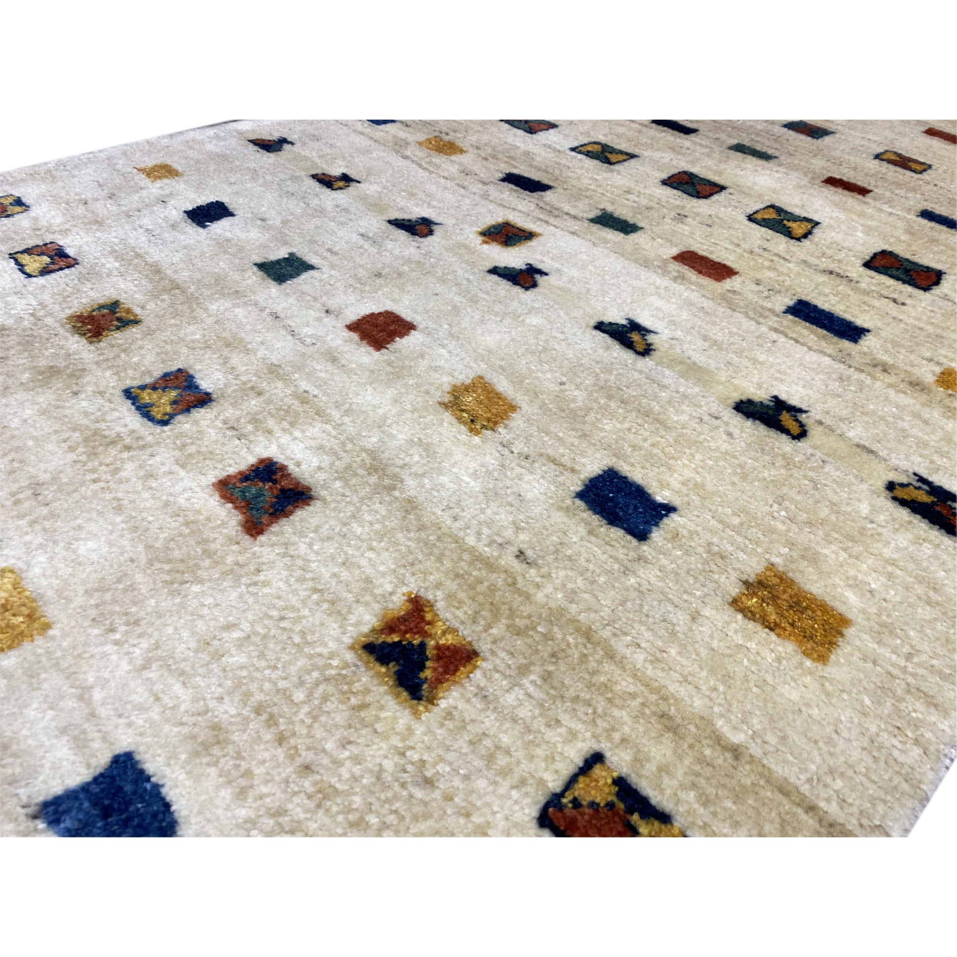このユニークな手織りのガベ絨毯は、サイズ152x89cmで、手紡ぎの植物染めウールで作られています。明るいベージュの地にカラフルな長方形と正方形の遊び心あるパターンが特徴のモダンなデザインです。モダン、コンテンポラリー、エクレクティックなスタイルのいずれの空間にも生き生きとしたアクセントを加え、本物のガベ絨毯ならではの自然な温かみと質感をもたらします。