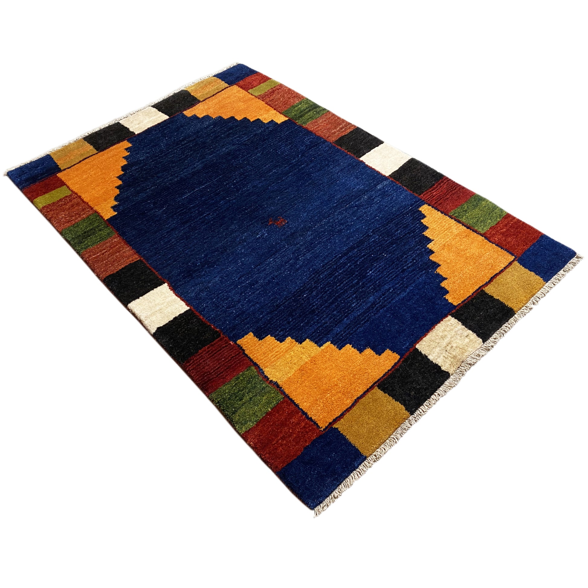 この手織りのGabbehラグは、164x114cmのサイズで、手紡ぎの植物染めウールから作られており、自然で素朴なアクセントをお部屋にもたらします。中央の菱形模様と鮮やかな色彩を持つミニマリストデザインは、現代的および伝統的なインテリアスタイルのどちらにも合い、温かみと個性を与える多用途なアイテムです。