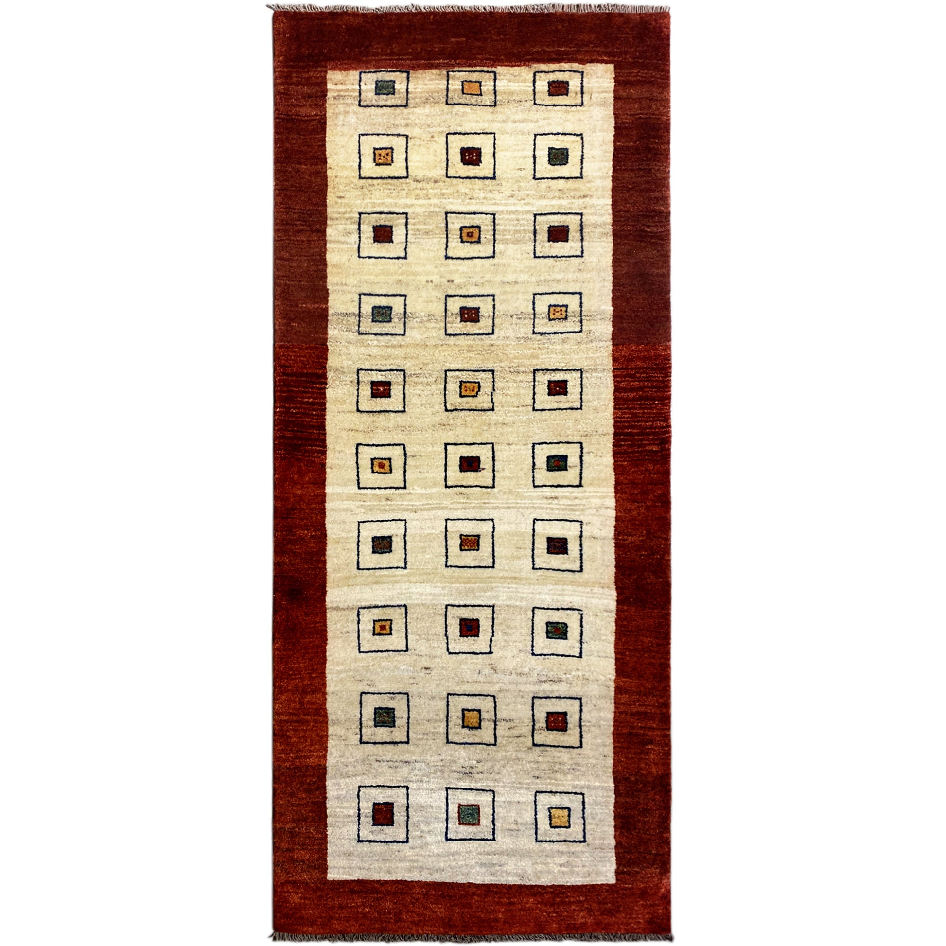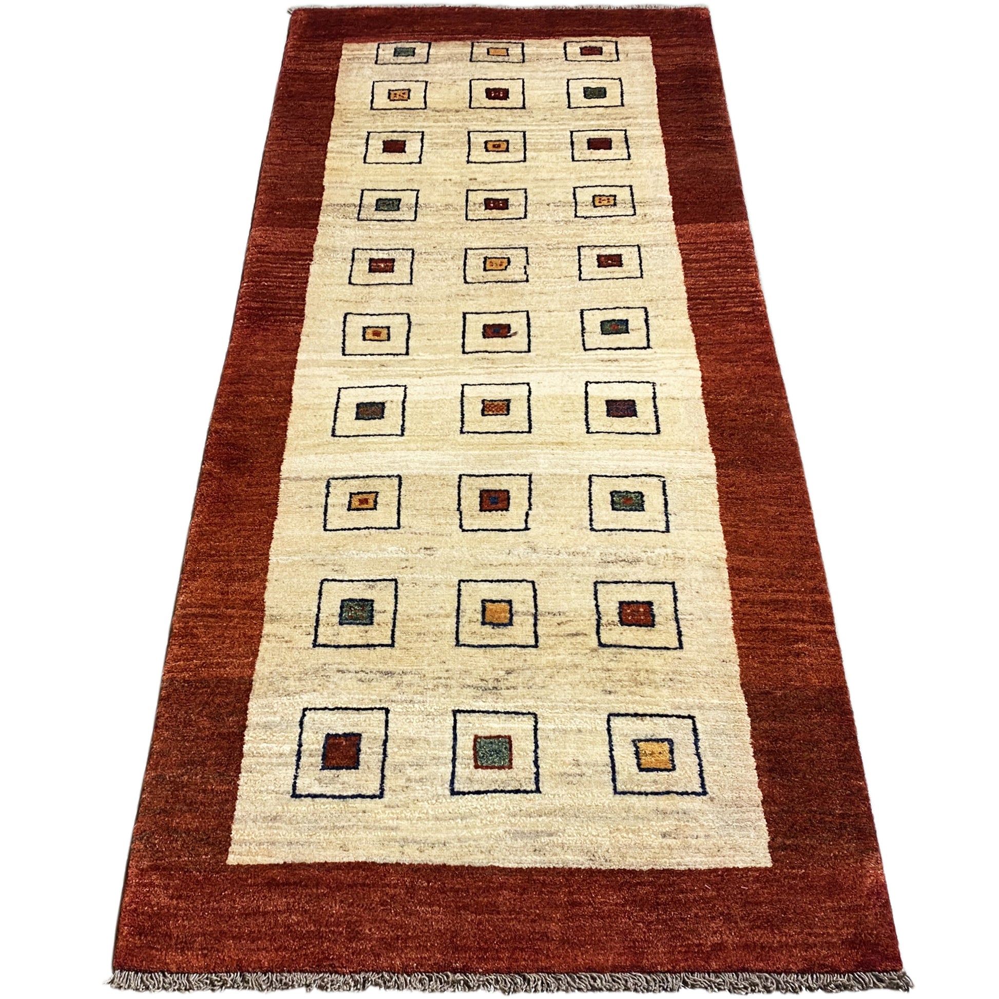 このユニークな手織りのGabbehランナー(サイズ195x84cm)は、手紡ぎの植物染めウールで作られています。デザインはナチュラルベージュのフィールドに、個々のスタイライズされた四角形の格子があり、小さな伝統的なモチーフが含まれ、赤錆色のボーダーで縁取られています。廊下や狭い空間に最適で、このランナーはご自宅に素朴でトライバルな魅力を添え、自然な暖かさと居心地の良さをもたらします。