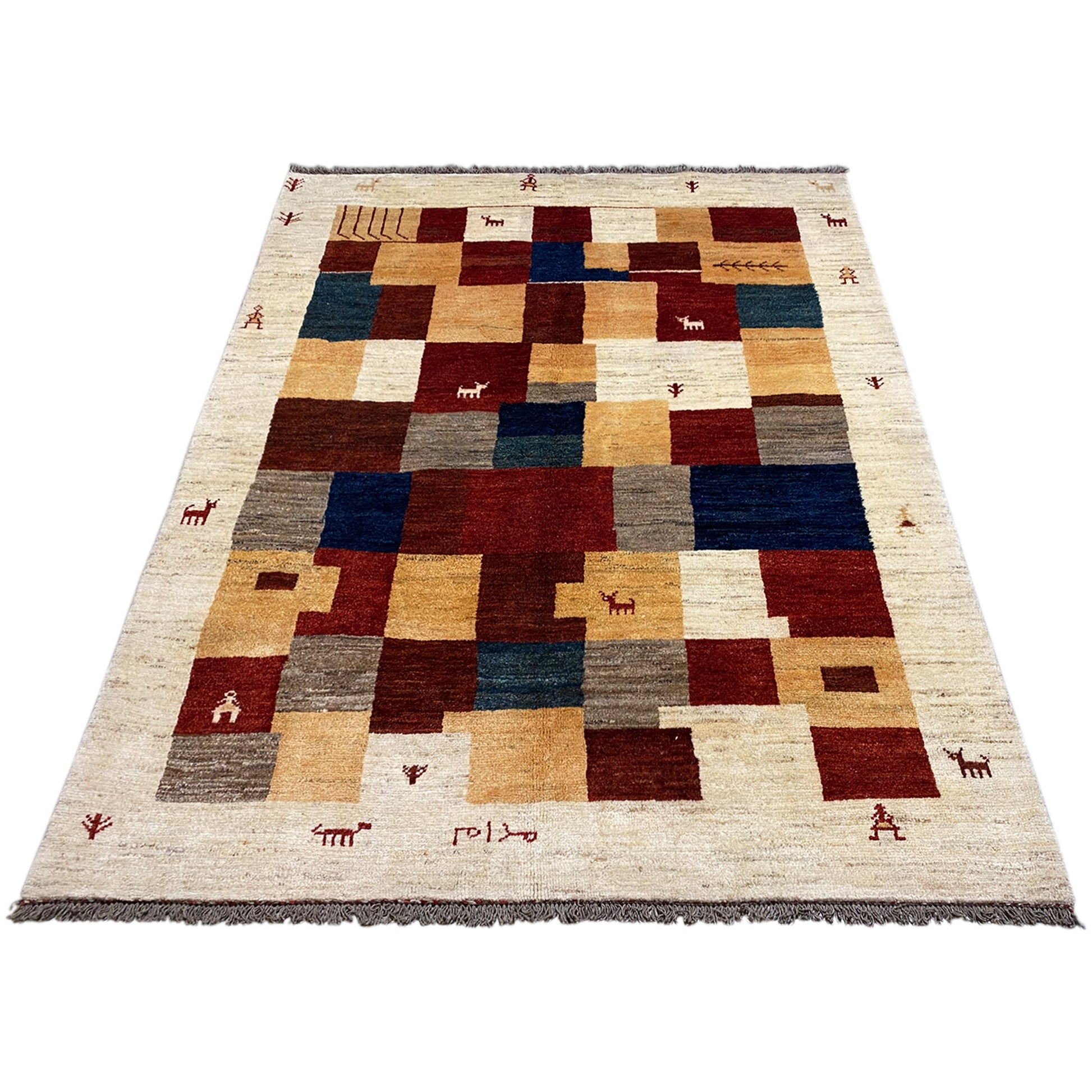 このユニークな手結びのガベ絨毯は、手紡ぎで植物染めされた羊毛を使用し、温かみのあるアースカラーと鮮やかな青色のダイナミックなパッチワーク模様が特徴です。明るい縁取りには魅力的で様式化された動物や人のモチーフがあしらわれています。229×163cmのゆったりとしたサイズで、伝統的からエクレクティックな空間まで、どんな部屋にも芸術的でありながら自然と調和した雰囲気をもたらす理想的なステートメントピースです。伝統的な職人技と遊び心あるデザインの組み合わせが、この絨毯を特別な注目の的にし、視覚的な興味を引きつけると同時に居心地の良さも提供します。