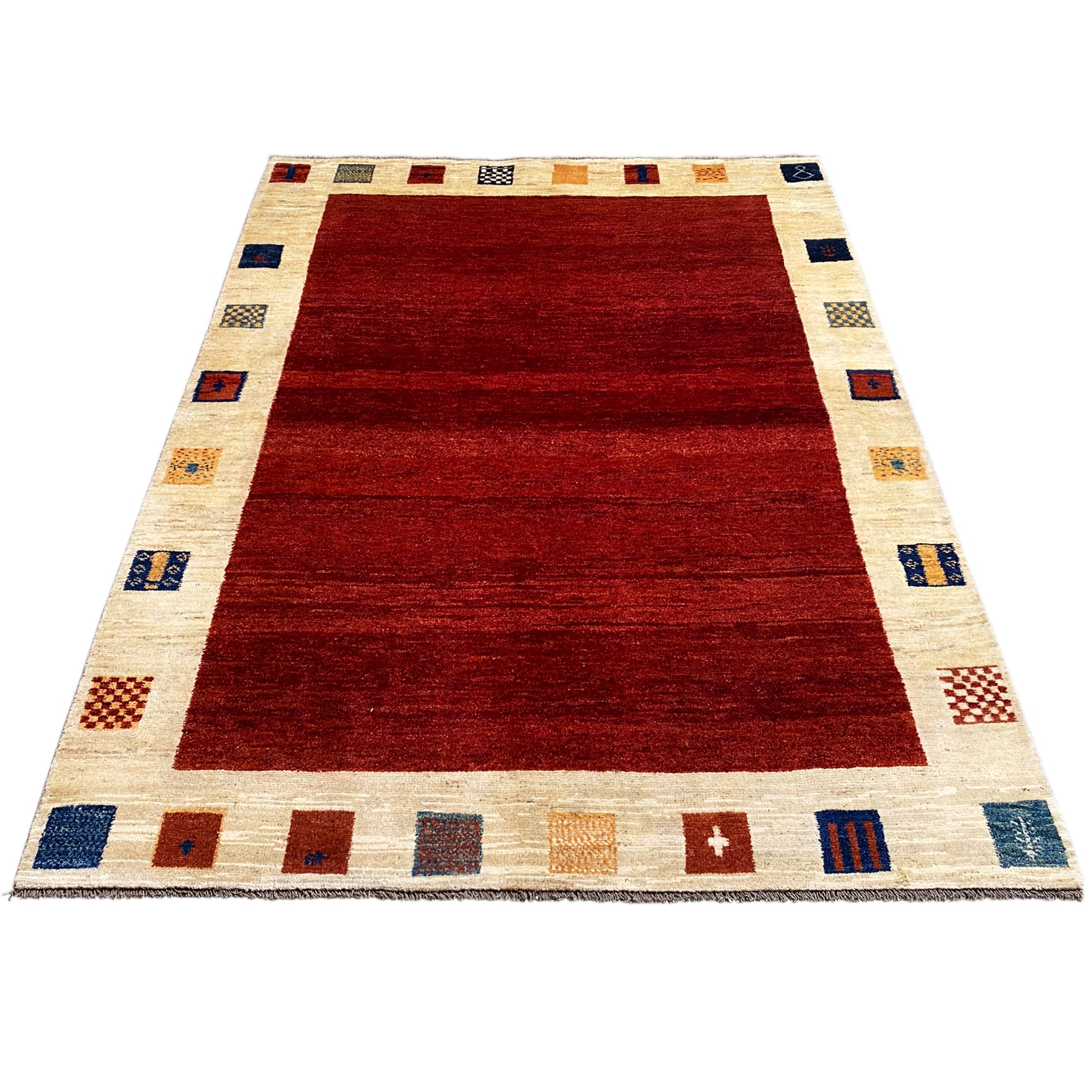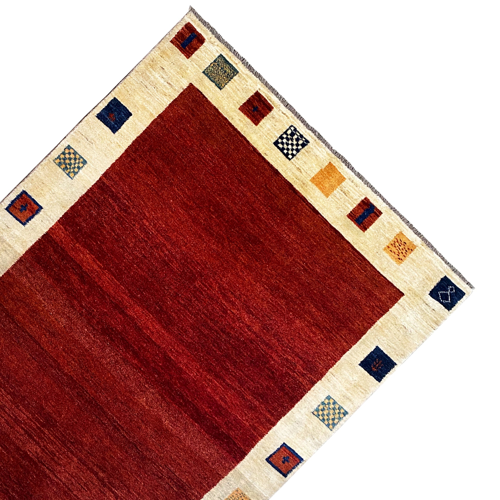 この壮麗な手織りのガベ絨毯は、手紡ぎで植物染めされた羊毛から作られており、中央の温かみのある赤色と、色とりどりの四角形でアクセントが付けられた特徴的なベージュの縁取りが魅力です。231×164cmのゆったりとしたサイズで、リビングやダイニングエリアの理想的なアクセントピースとなり、土のような落ち着きと同時に生き生きとした雰囲気をお部屋にもたらします。ミニマルながらも表現力豊かな模様と高品質な素材感が、素朴からモダンまで様々なインテリアスタイルに時代を超えた調和をもたらします。