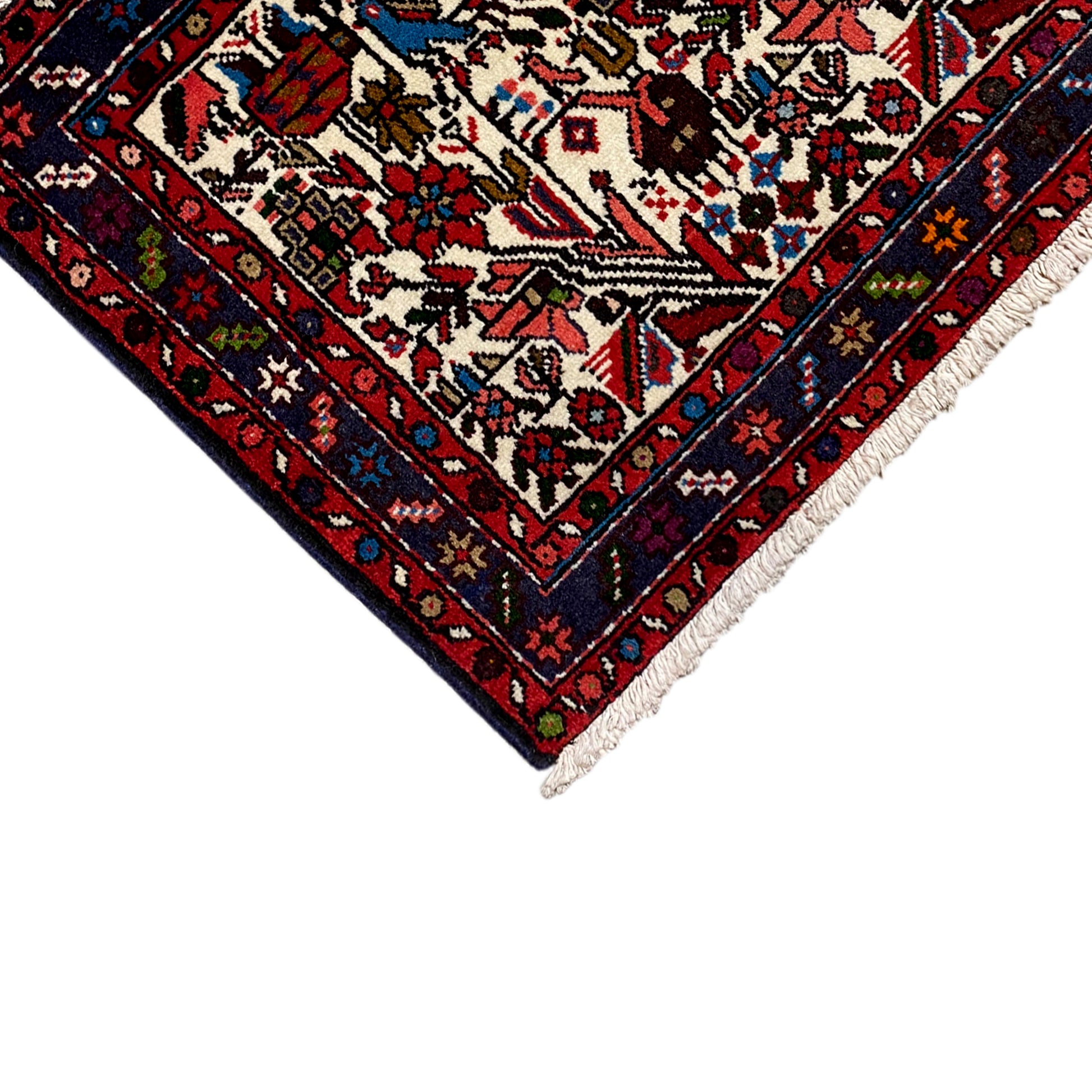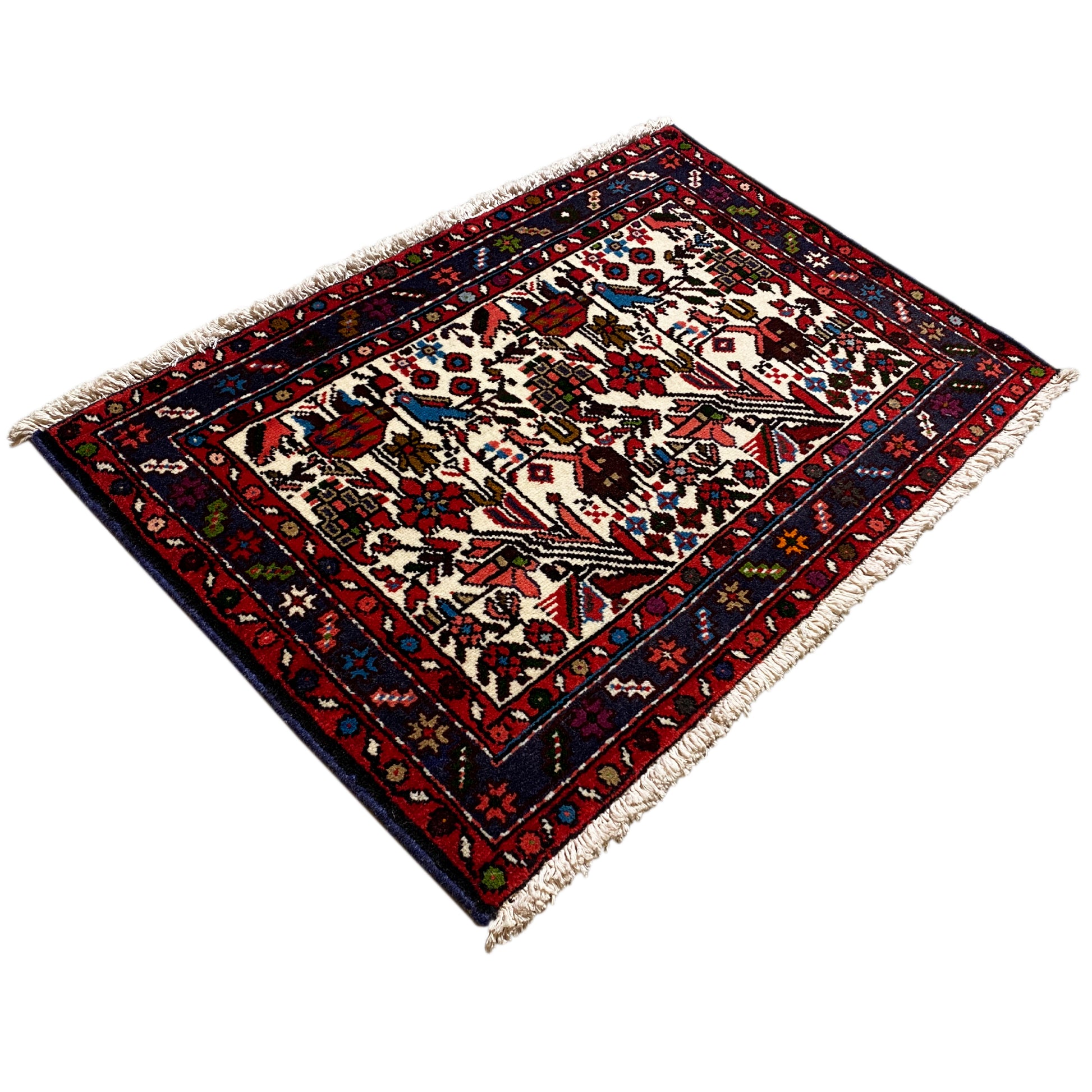 この手織りのポシュティ・ハメダン絨毯は、ウールと綿で作られており、明るい地に鳥や花の生き生きとした図柄が特徴です。88x62 cmのサイズで、伝統的または折衷的なスタイルのどんな部屋にも魅力的なアクセントを加えます。このユニークな作品の巧みな手仕事と鮮やかな色彩をぜひご体験ください。