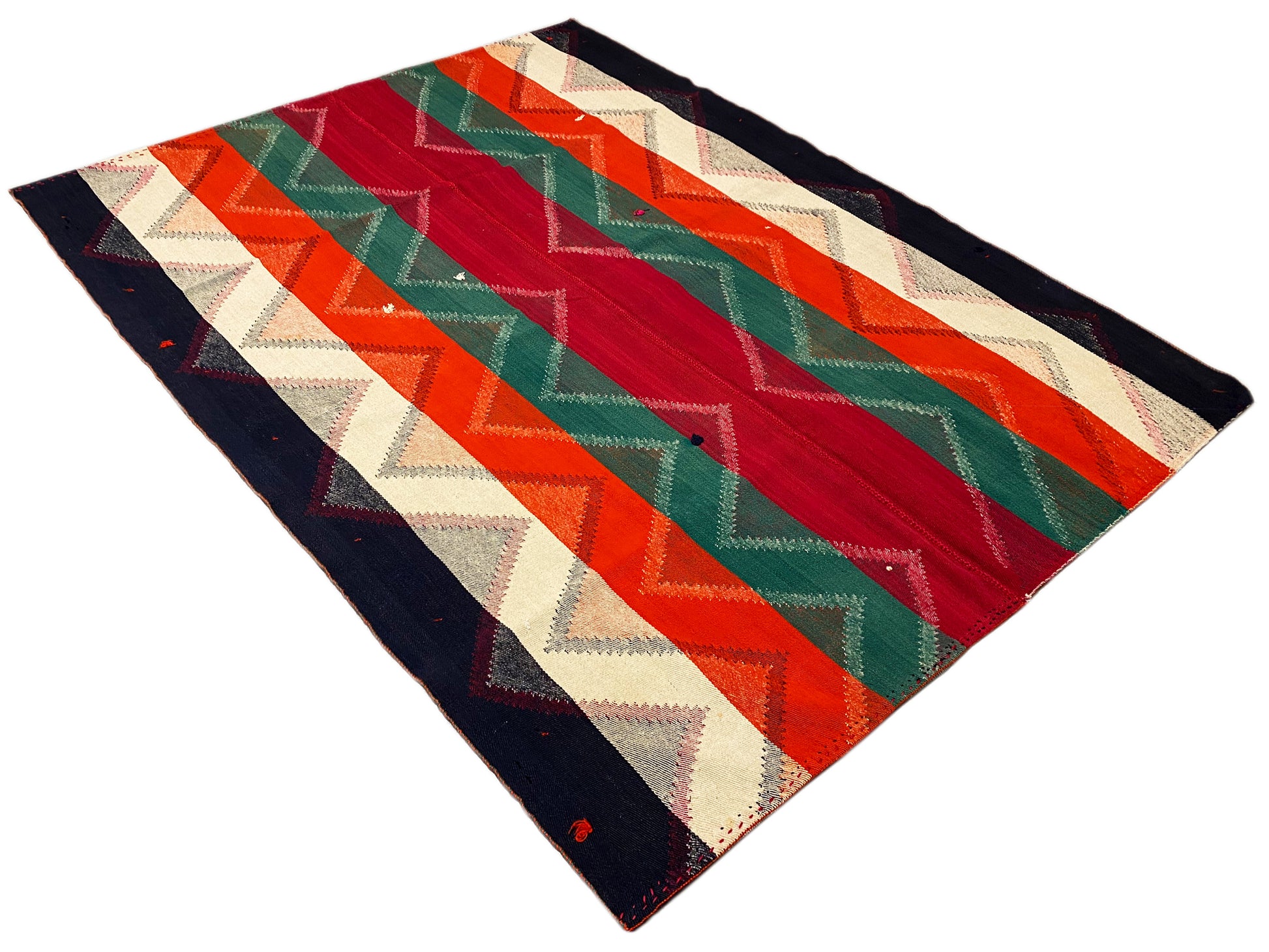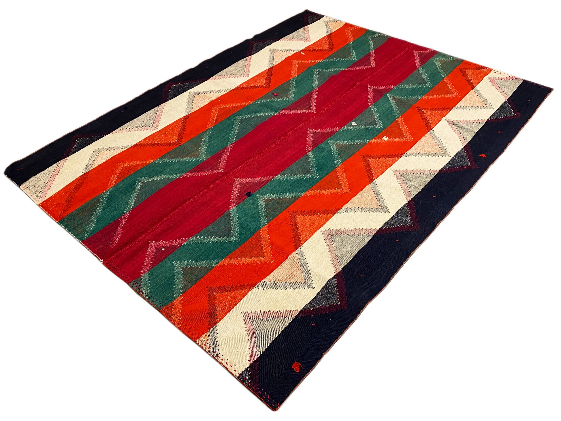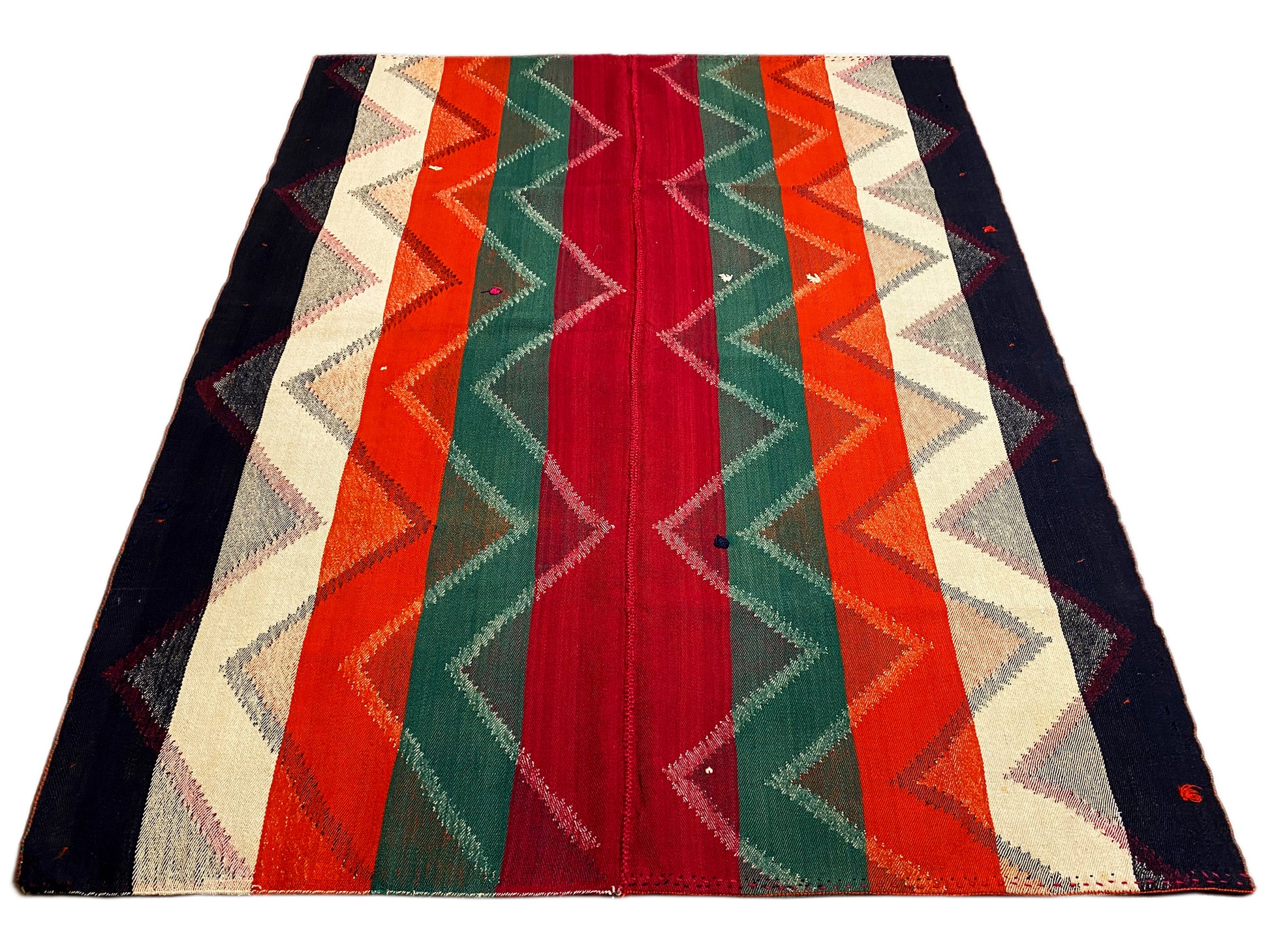 Dieser handgewebte Jajim Teppich aus handgesponnener Wolle besticht durch sein ausdrucksstarkes geometrisches Zigzag-Streifenmuster in intensiven Rot-, Grün-, Orange-, Blau- und Cremetönen, das ideal zum lebendigen Boho-Dekor-Stil passt; die großzügige Größe von 222x166 cm macht ihn perfekt für Wohn-, Schlaf- und Essbereiche, während seine robuste Wollqualität, traditionelle Webkunst und kräftige Farbgebung jedem Raum Wärme, Charakter und authentische Handwerksästhetik verleihen.
