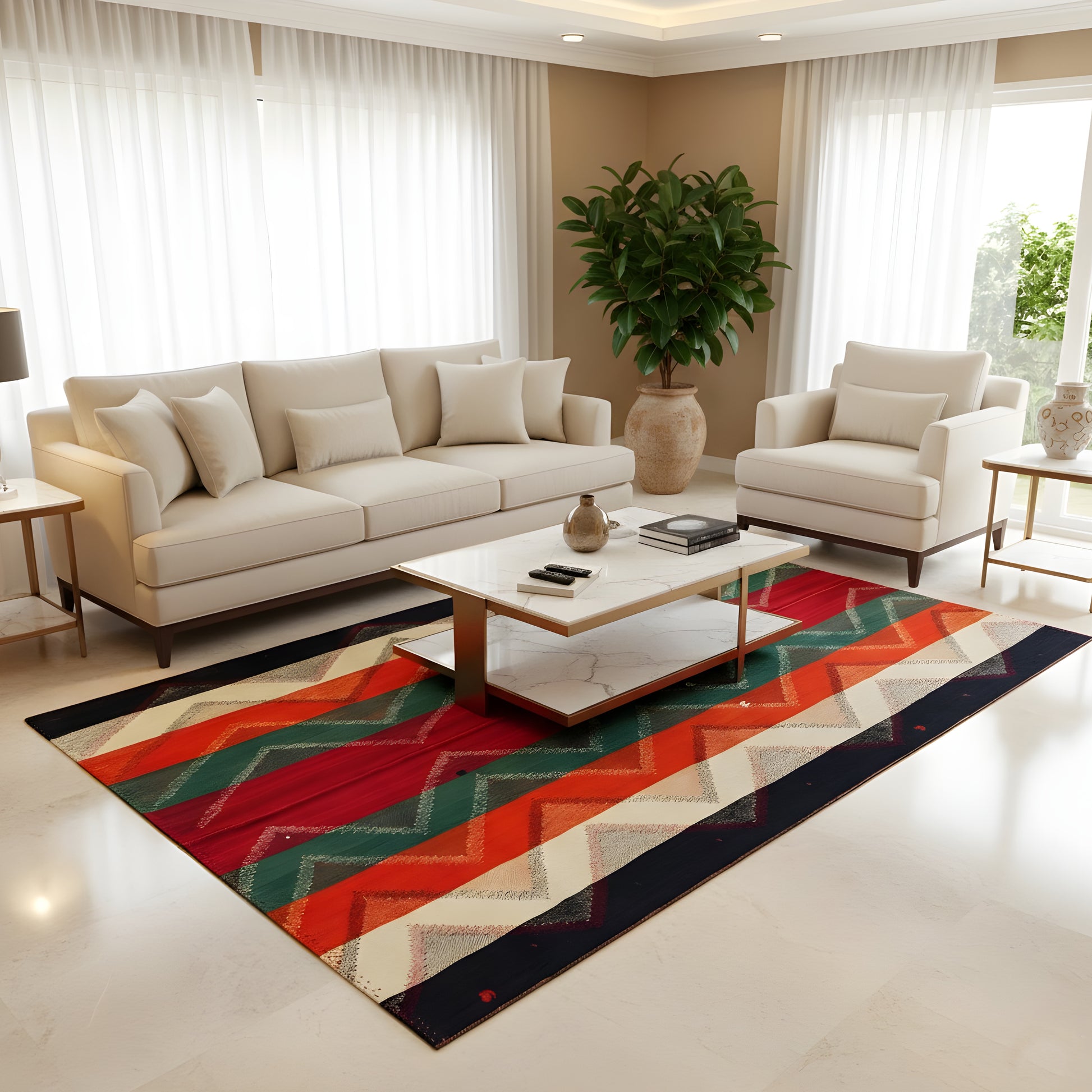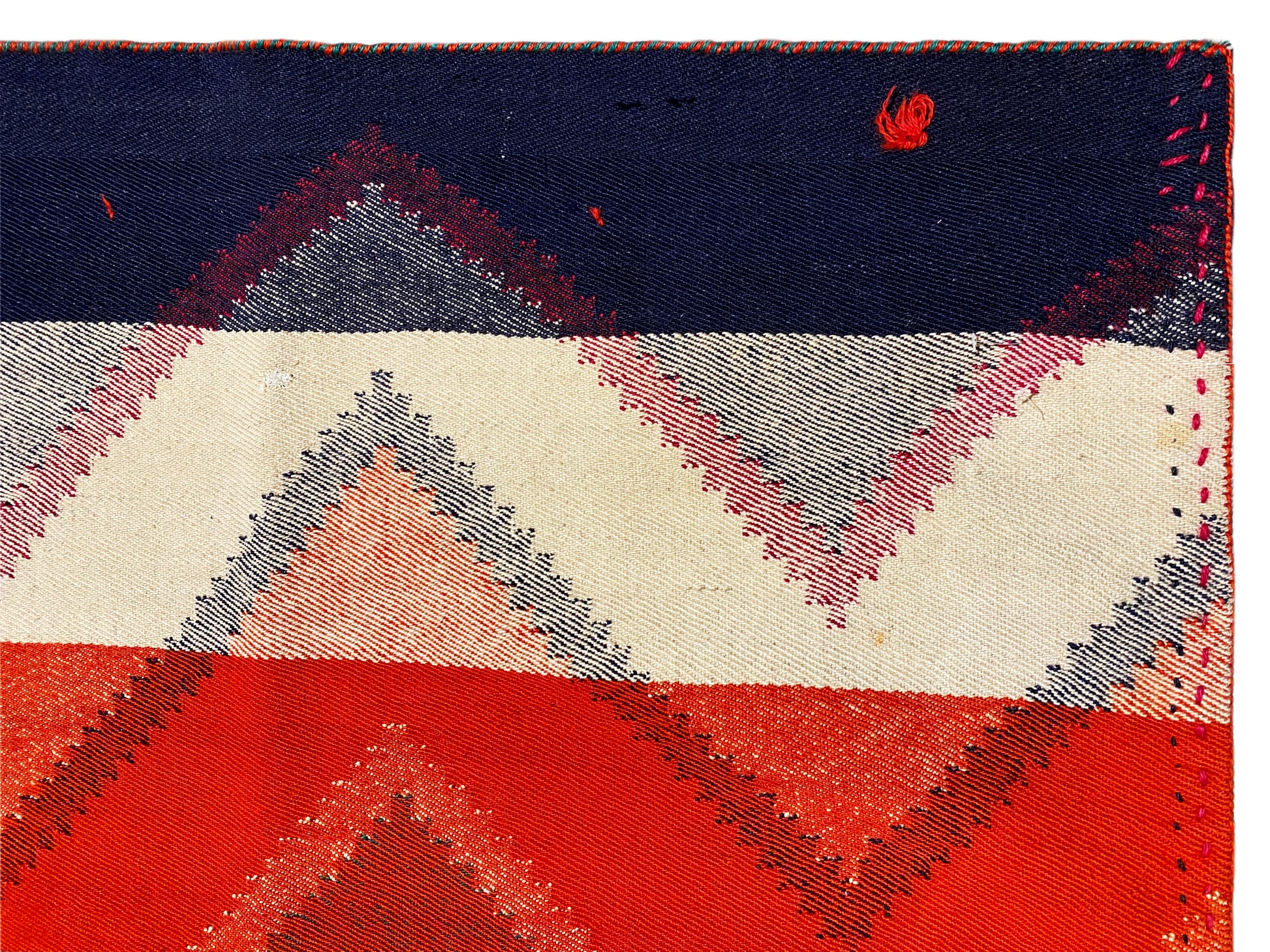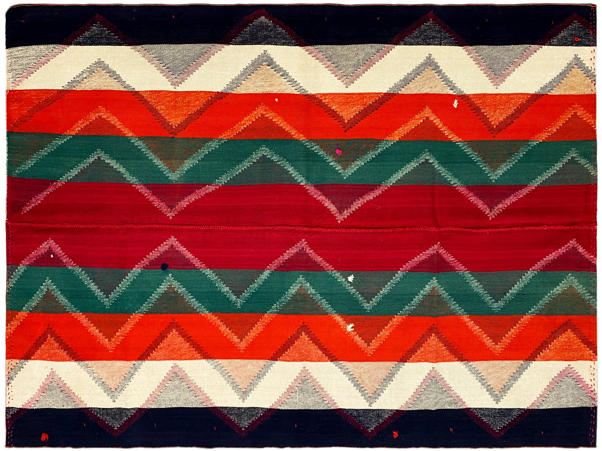 Dieser handgewebte Jajim Teppich aus handgesponnener Wolle besticht durch sein ausdrucksstarkes geometrisches Zigzag-Streifenmuster in intensiven Rot-, Grün-, Orange-, Blau- und Cremetönen, das ideal zum lebendigen Boho-Dekor-Stil passt; die großzügige Größe von 222x166 cm macht ihn perfekt für Wohn-, Schlaf- und Essbereiche, während seine robuste Wollqualität, traditionelle Webkunst und kräftige Farbgebung jedem Raum Wärme, Charakter und authentische Handwerksästhetik verleihen.