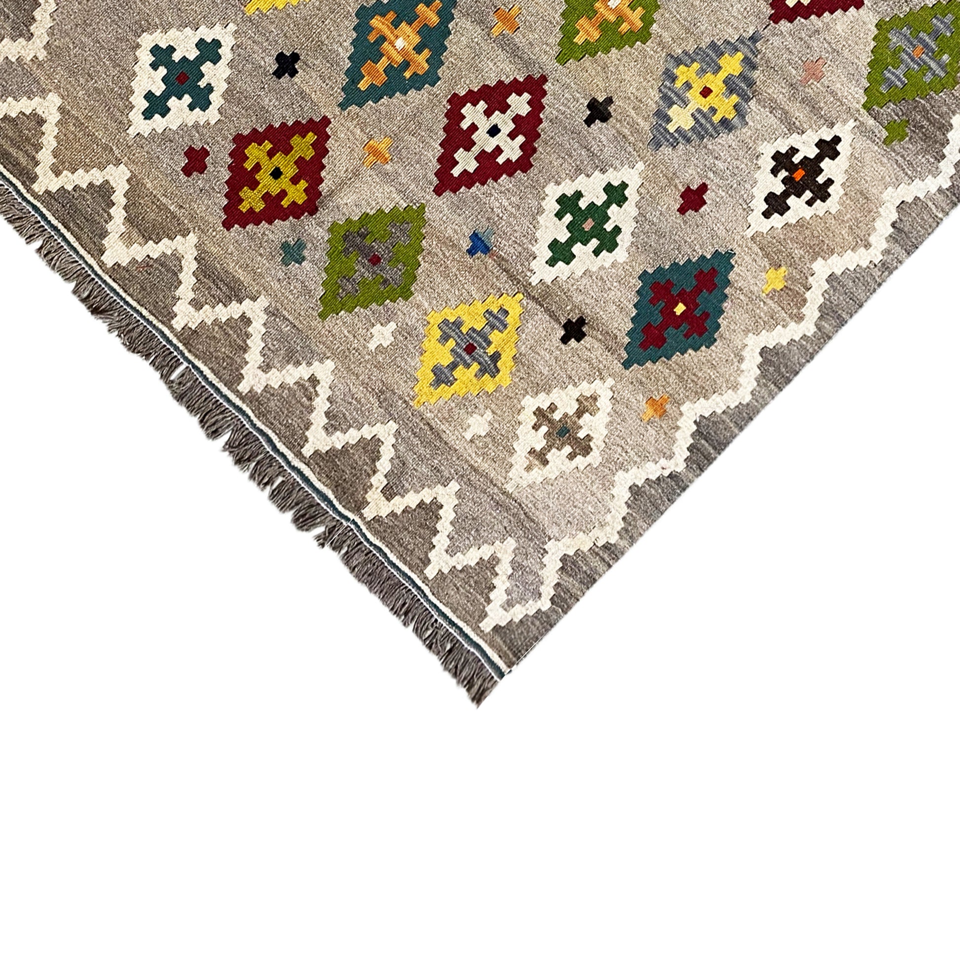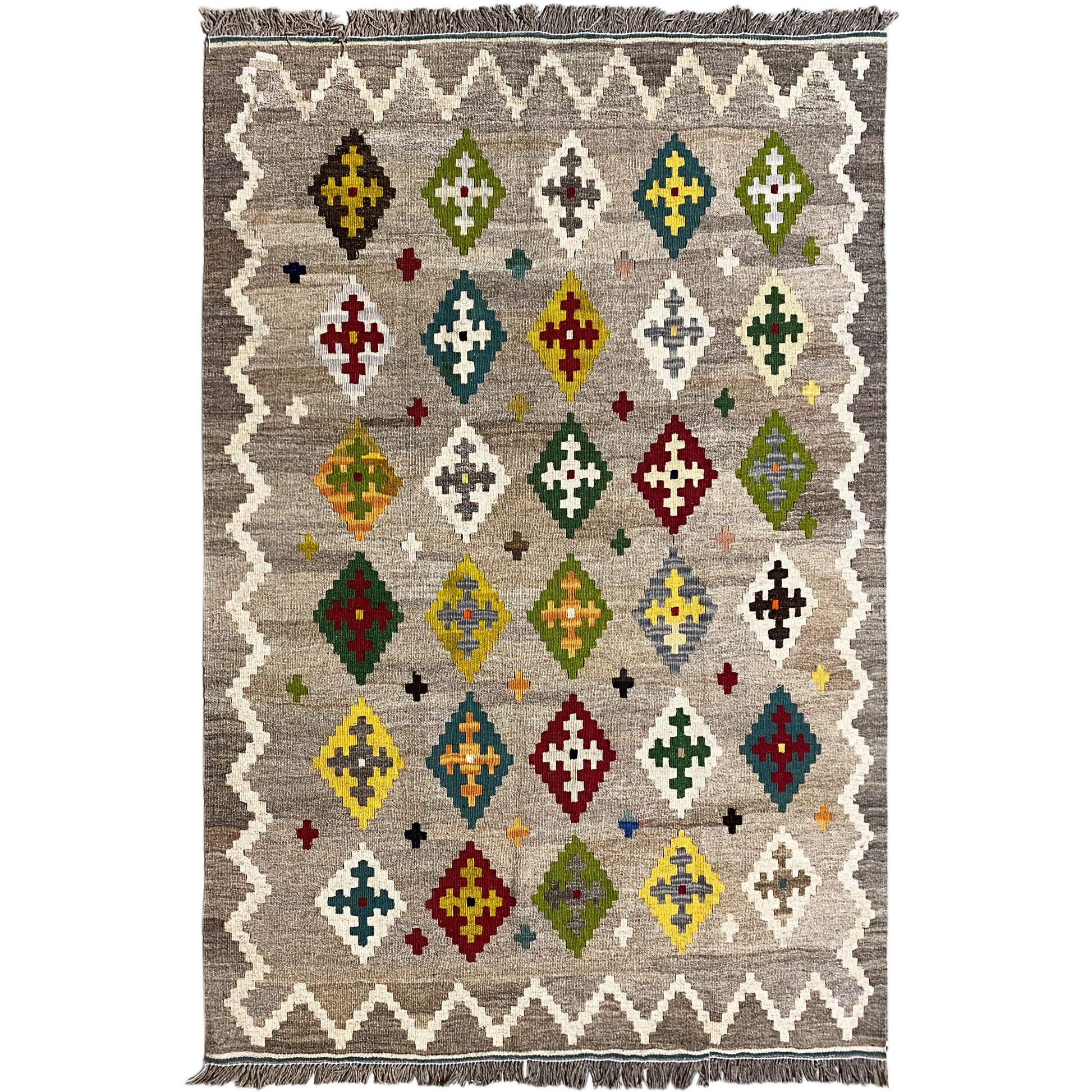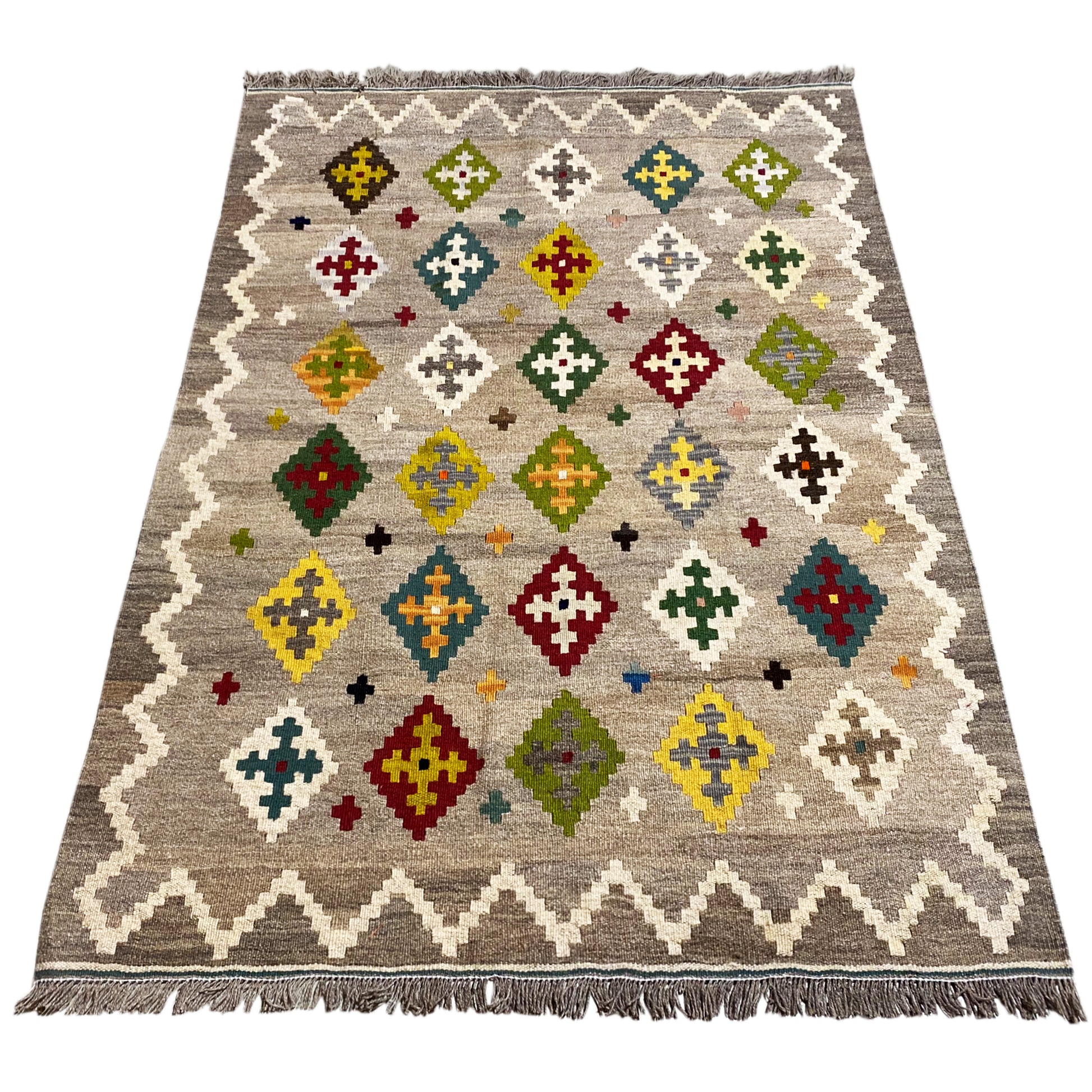 このユニークな手織りのケリム・カシュカイ絨毯は、手紡ぎの羊毛で作られており、どの部屋にも本格的で素朴な、またはボヘミアンな雰囲気を与えます。146x100 cmのサイズで鮮やかな幾何学的な菱形模様を持つこの丈夫な平織り絨毯は、リビングルーム、寝室、または廊下に温かみと個性を添えるのに最適です。高品質の羊毛から作られており、耐久性と心地よい手触りを提供し、その時代を超えたデザインはインスピレーションを与える装飾となります。