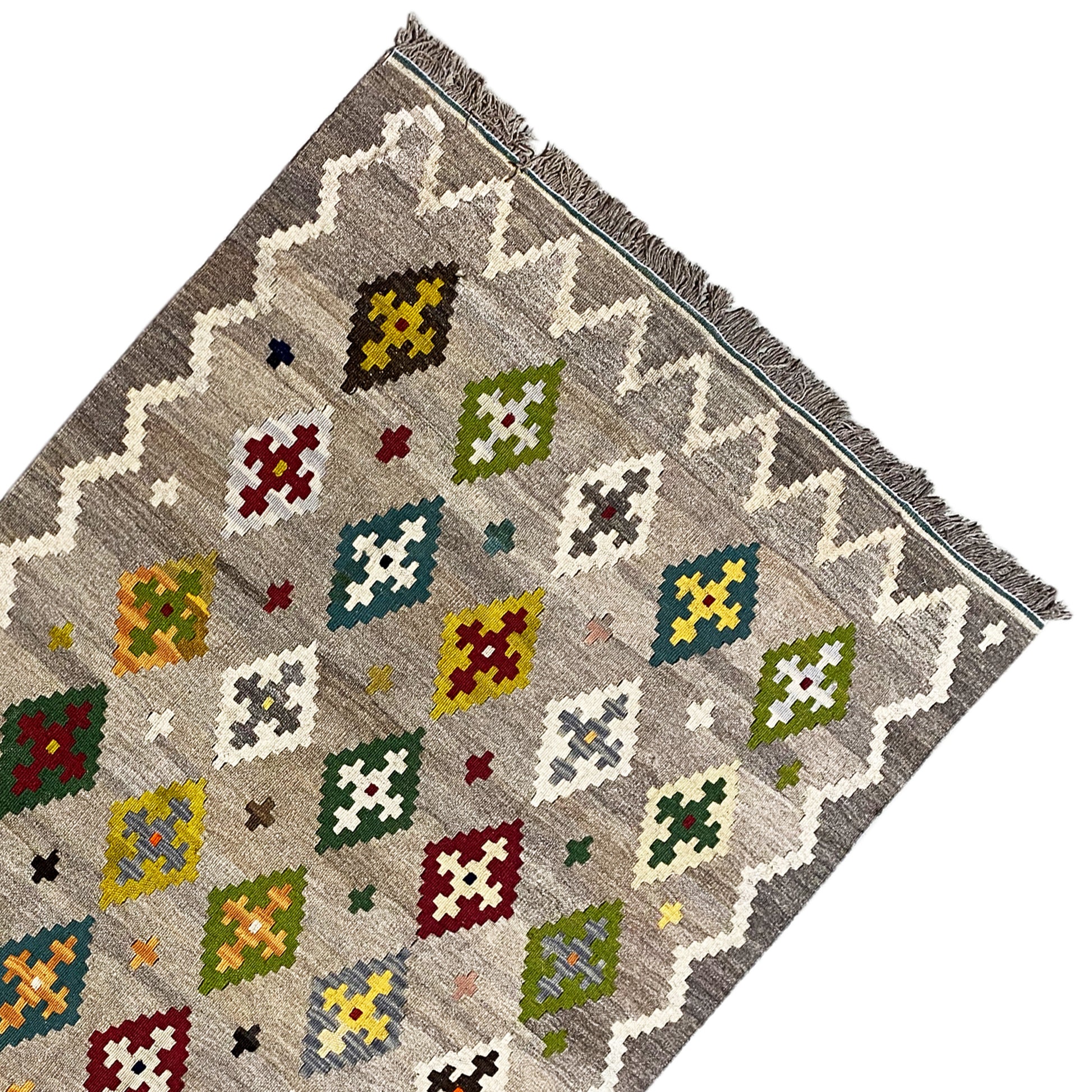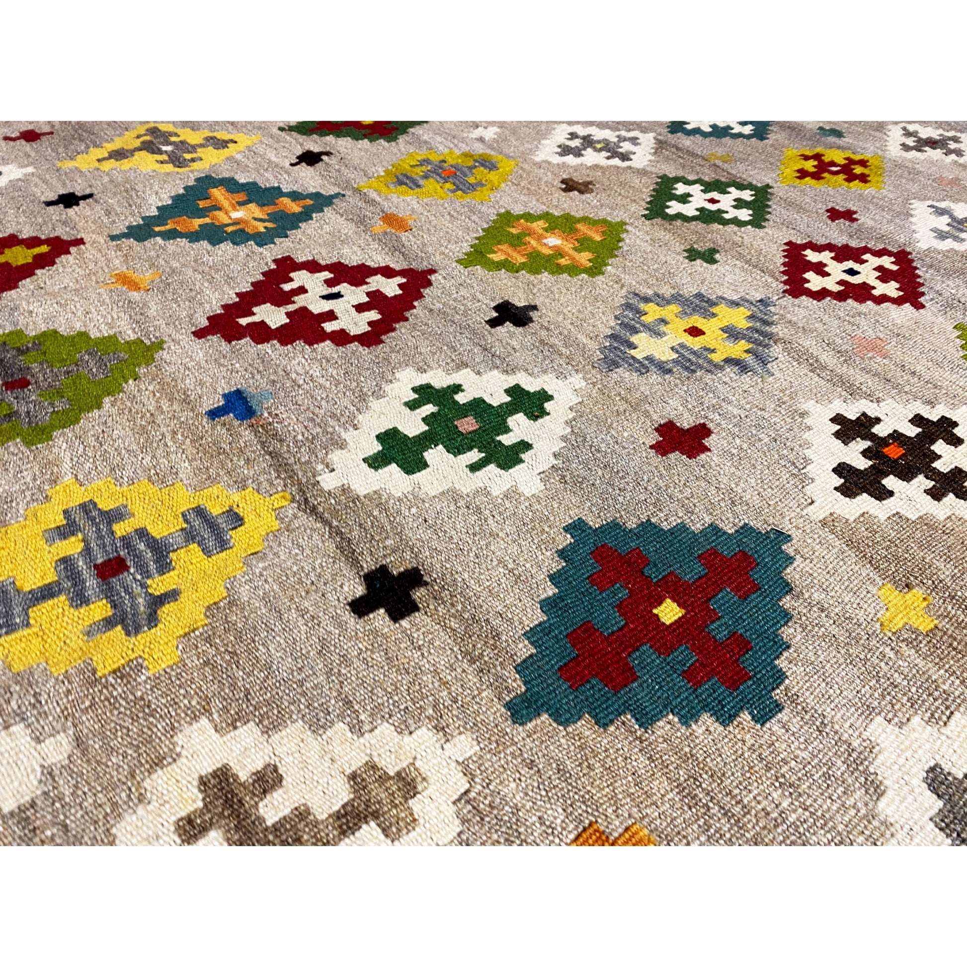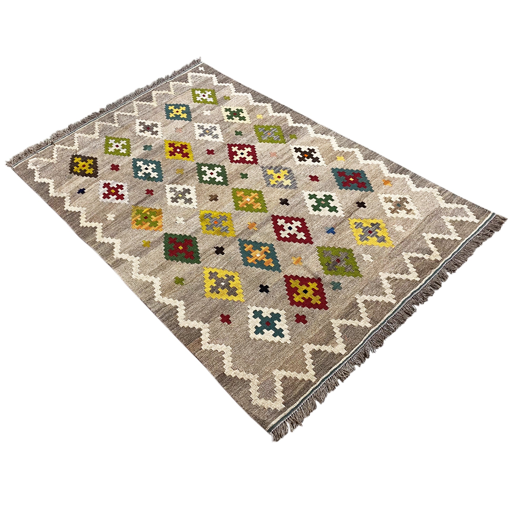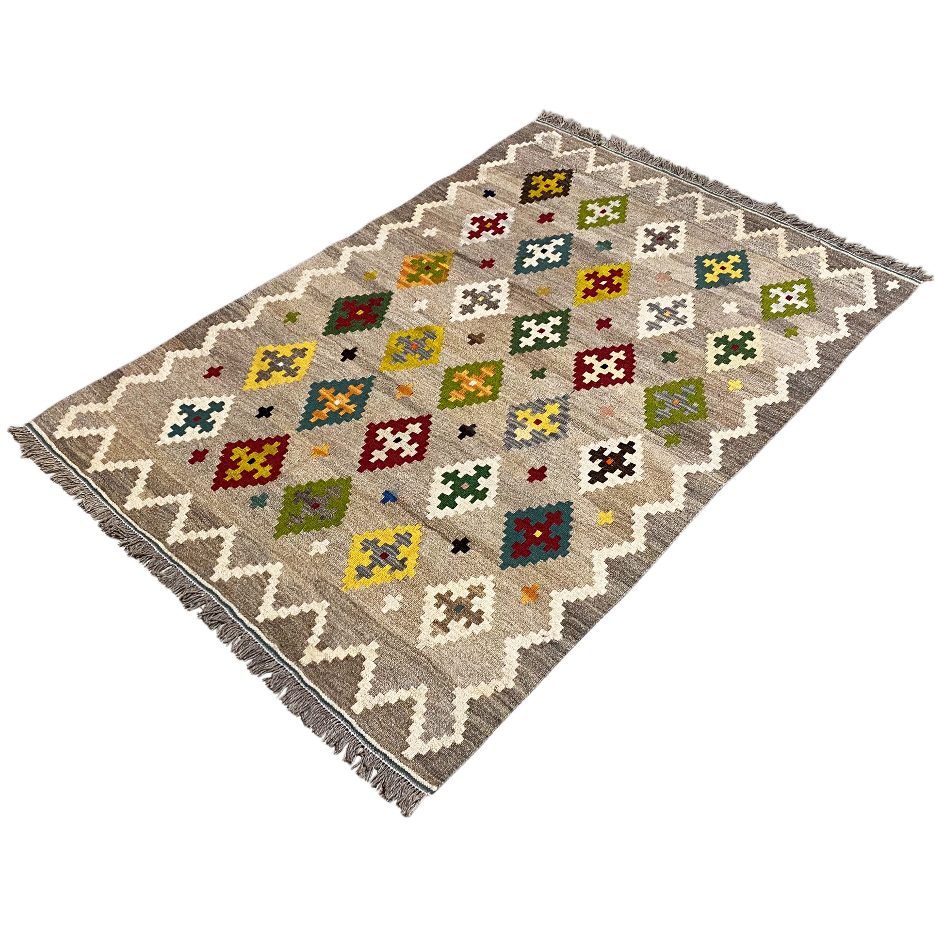 このユニークな手織りのケリム・カシュカイ絨毯は、手紡ぎの羊毛で作られており、どの部屋にも本格的で素朴な、またはボヘミアンな雰囲気を与えます。146x100 cmのサイズで鮮やかな幾何学的な菱形模様を持つこの丈夫な平織り絨毯は、リビングルーム、寝室、または廊下に温かみと個性を添えるのに最適です。高品質の羊毛から作られており、耐久性と心地よい手触りを提供し、その時代を超えたデザインはインスピレーションを与える装飾となります。
