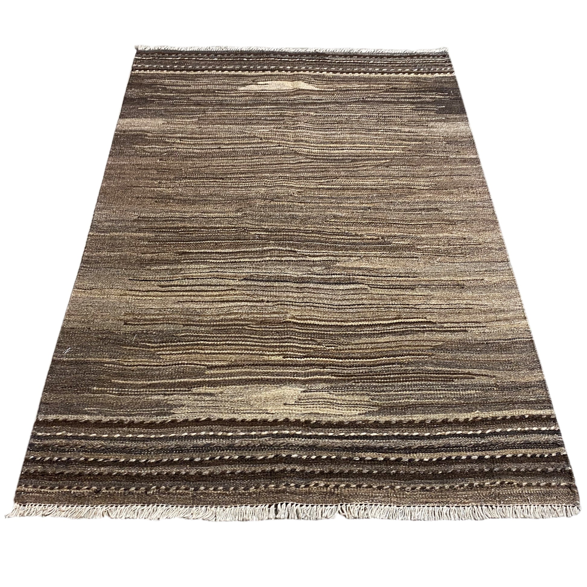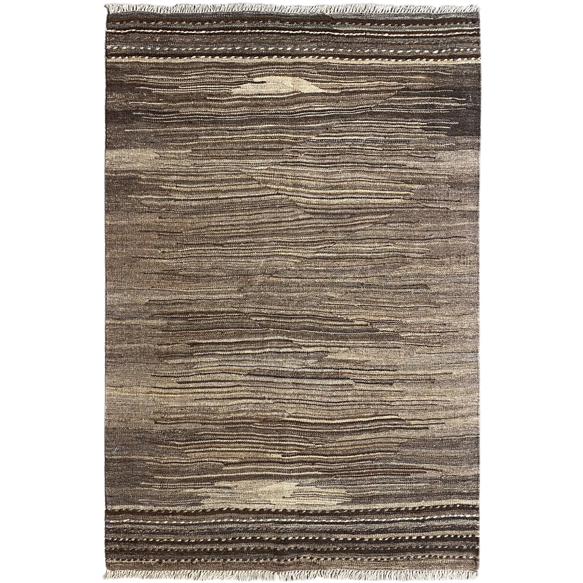 このユニークな手織りのケリム・カシュカイは、手紡ぎの羊毛を使用し、落ち着いたブラウンとベージュのトーンに、自然な雰囲気を醸し出す控えめで抽象的なストライプ模様が施されています。サイズは153x102cmで、耐久性のある平織りのこのラグは、居心地の良い素朴な雰囲気やミニマリストな空間を作り出すのに最適です。純粋な羊毛の本物の手触りと耐久性を提供し、廊下や寝室、リビングのアクセントとして完璧で、どんなお宅にも時代を超えた魅力を加えます。