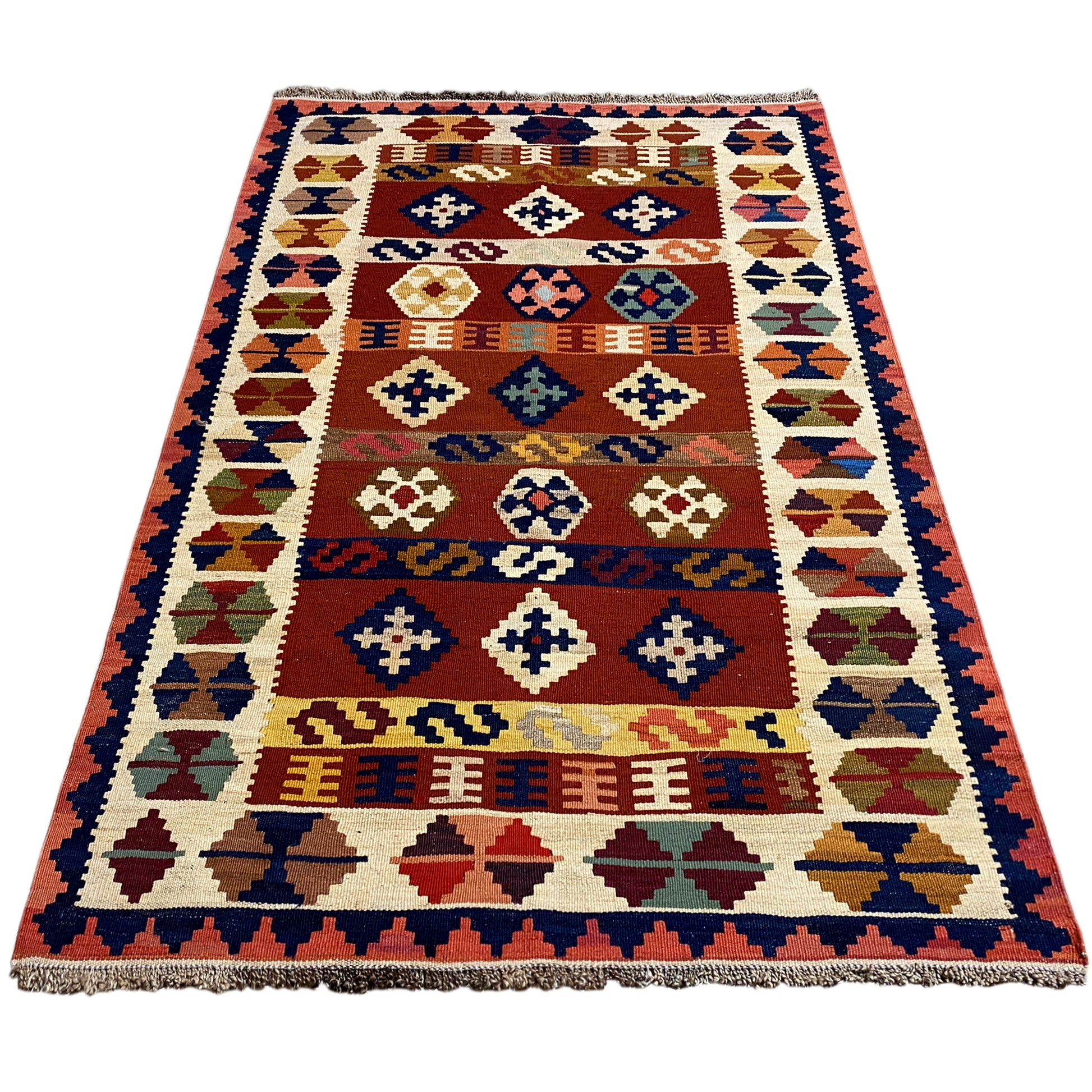 この手紡ぎの羊毛で手織りされたケリム・カシュカイ絨毯は、鮮やかで多色使いのデザインが特徴で、幾何学的な菱形模様やトライバルパターンが豊富に施された赤を基調とした中央部分が目を引きます。サイズは177x118cmで、ボヘミアン、トライバル、または伝統的なスタイルの空間に、本物らしい色彩豊かなアクセントを加えるのに最適な丈夫な平織り絨毯です。細部にわたる職人技、自然素材、耐久性が際立ち、どんな家にも温かみと個性をもたらします。