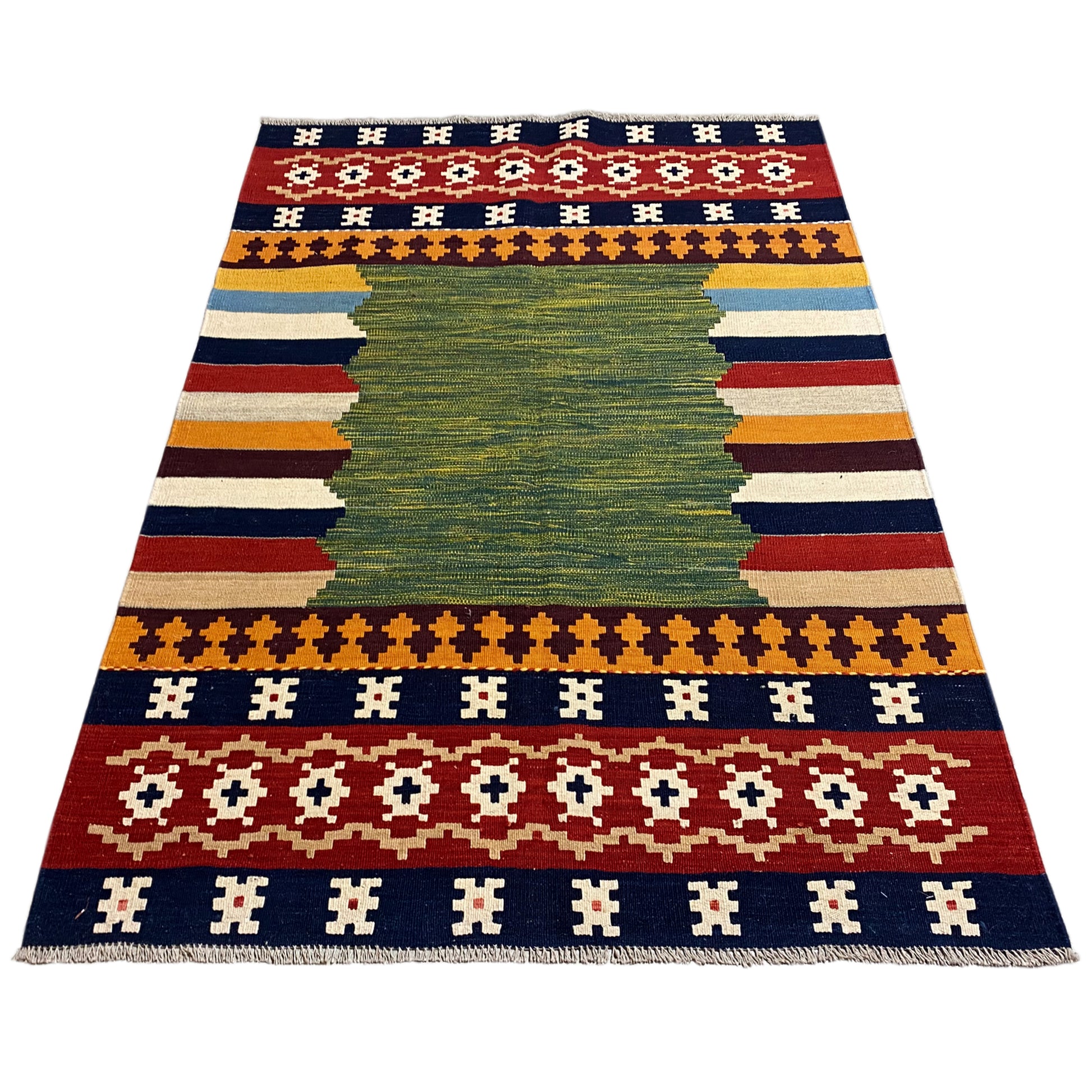 この生き生きとした手織りのケリム・カシュカイは、手紡ぎの羊毛で作られた民族工芸の傑作であり、そのカラフルなデザインと178x121 cmのサイズがひと目で目を引きます。特徴的な緑色の中央フィールドに、赤、青、黄、オレンジの周囲の帯が組み合わされ、伝統的な幾何学模様で飾られています。ボヘミアン、トライバル、エクレクティックなインテリアスタイルに最適で、この丈夫な平織りのラグは視覚的な魅力だけでなく、純粋な羊毛の自然な手触りと耐久性を提供し、どんな空間にも温かみと個性をもたらします。