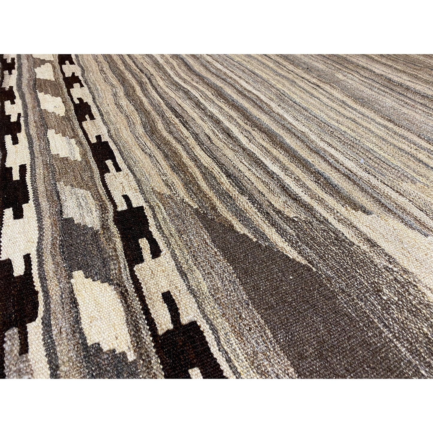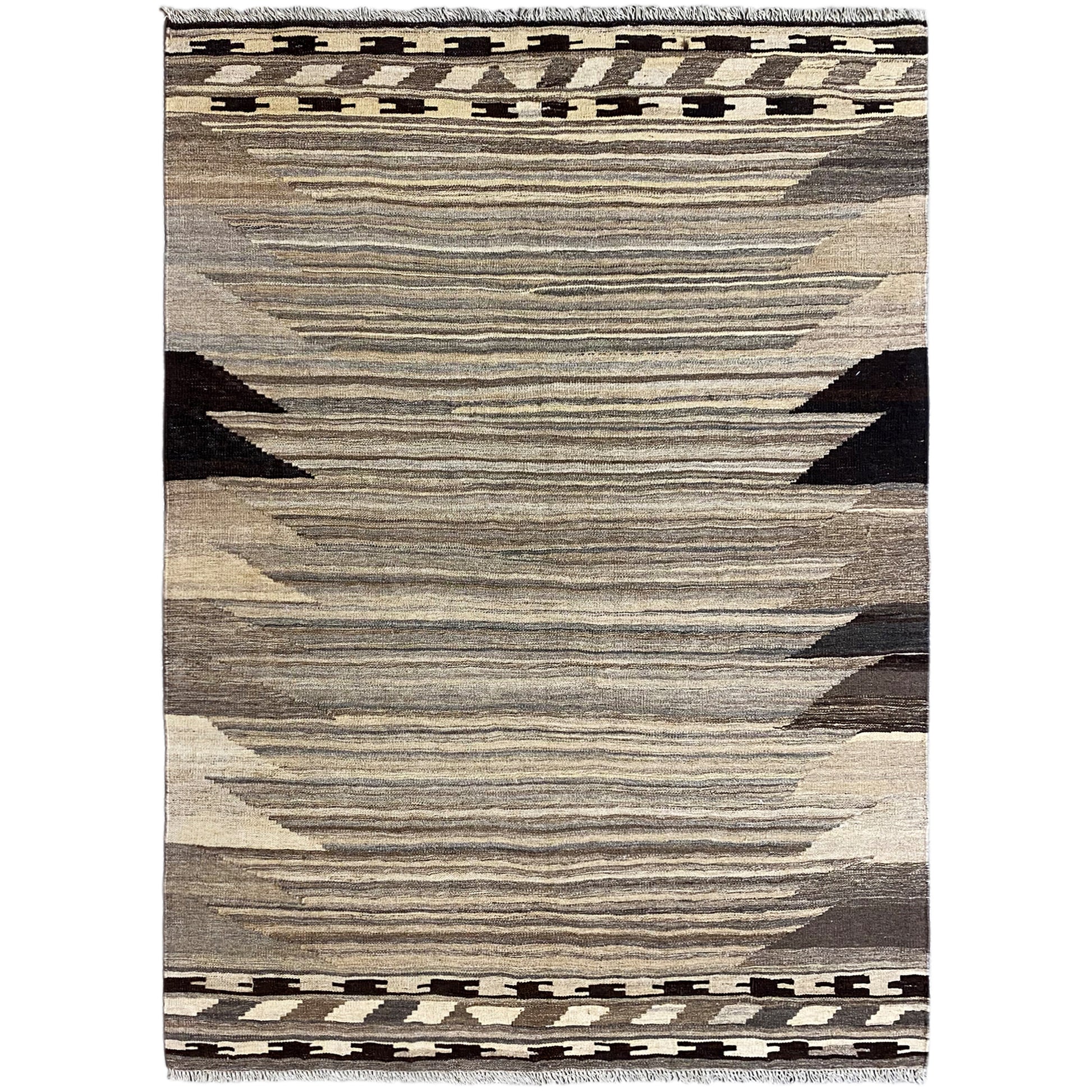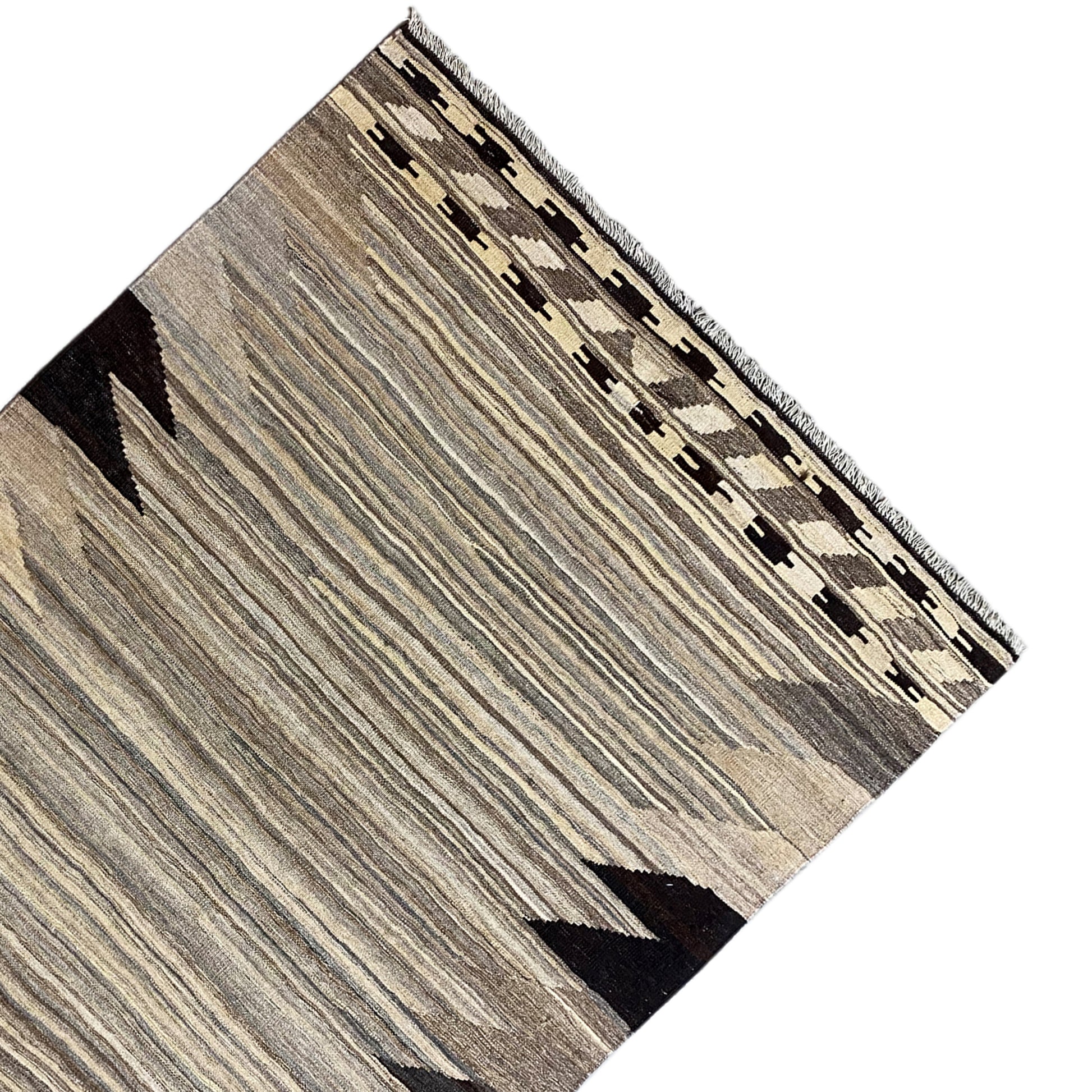 この手紡ぎの羊毛で手織りされたケリム・カシュカイ絨毯は、自然なグレーとベージュのトーンで際立つ幾何学的な形とストライプを特徴とする独特の抽象デザインを披露しています。サイズは197x148cmで、この丈夫な平織りの絨毯は、モダン、ミニマリスト、またはスカンジナビア風のインテリアスタイルを引き立てるのに最適です。伝統的な職人技と現代的な美学を融合させ、落ち着きながらも表現力豊かな雰囲気を作り出し、どんな空間も格上げしつつ耐久性も提供します。"}