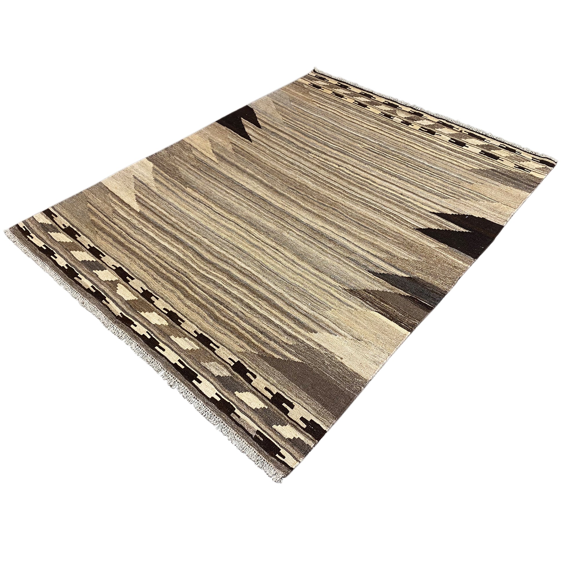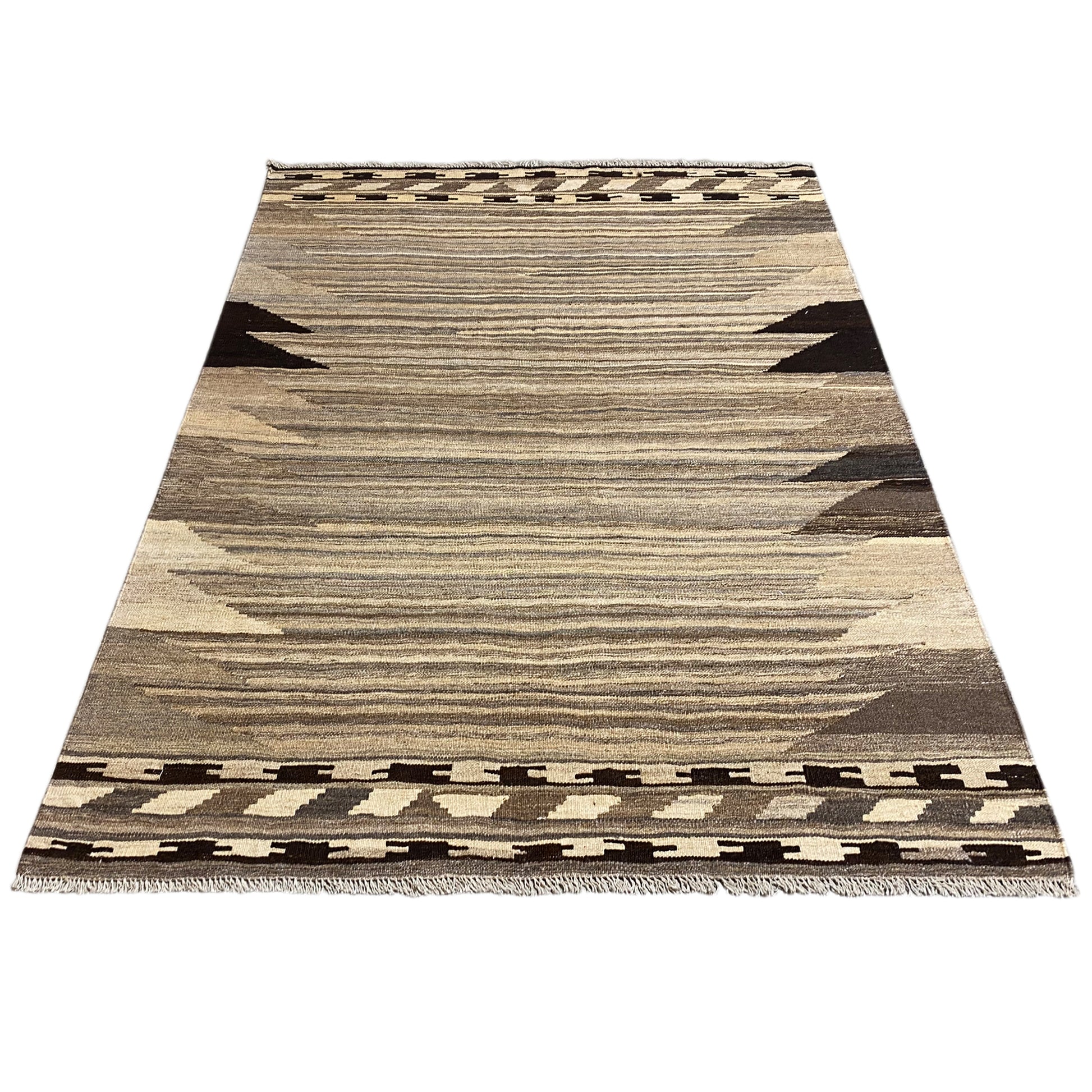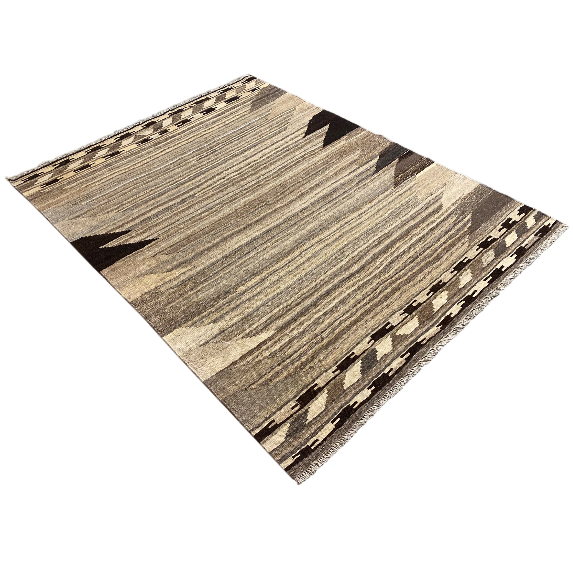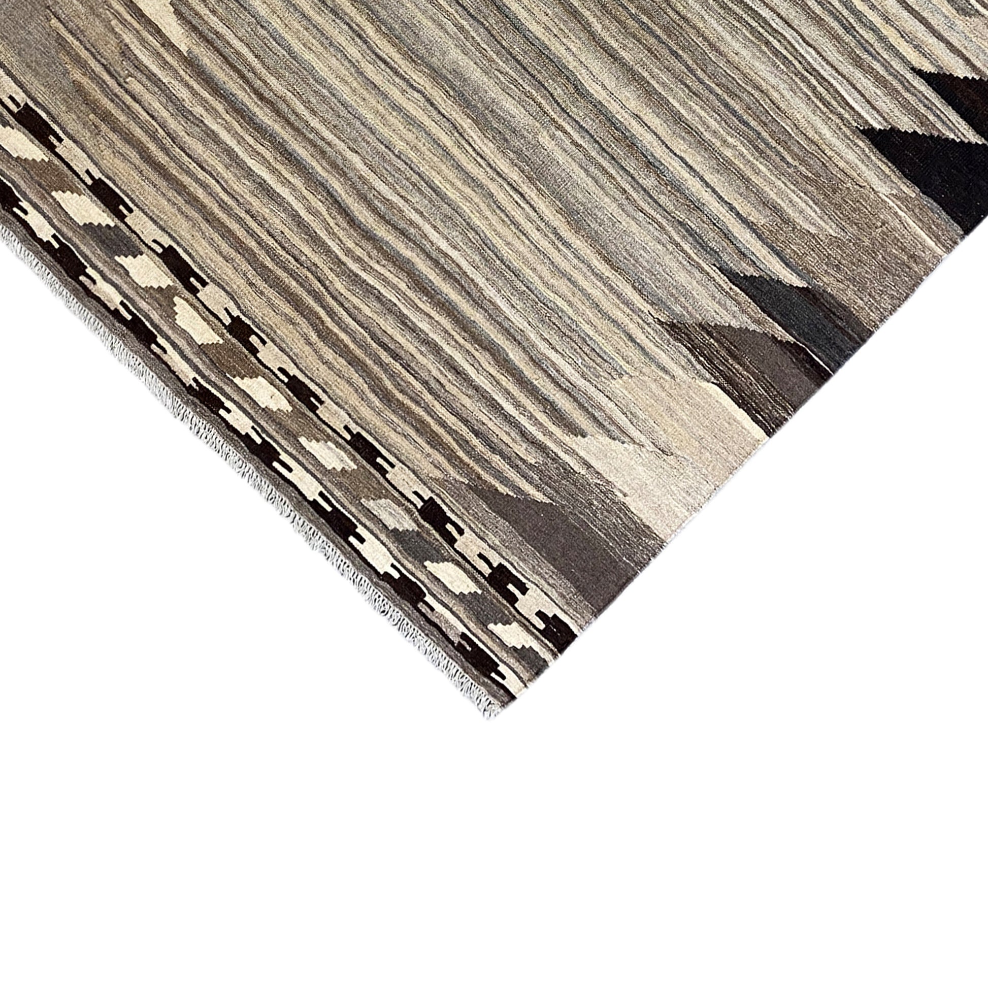 この手紡ぎの羊毛で手織りされたケリム・カシュカイ絨毯は、自然なグレーとベージュのトーンで際立つ幾何学的な形とストライプを特徴とする独特の抽象デザインを披露しています。サイズは197x148cmで、この丈夫な平織りの絨毯は、モダン、ミニマリスト、またはスカンジナビア風のインテリアスタイルを引き立てるのに最適です。伝統的な職人技と現代的な美学を融合させ、落ち着きながらも表現力豊かな雰囲気を作り出し、どんな空間も格上げしつつ耐久性も提供します。"}