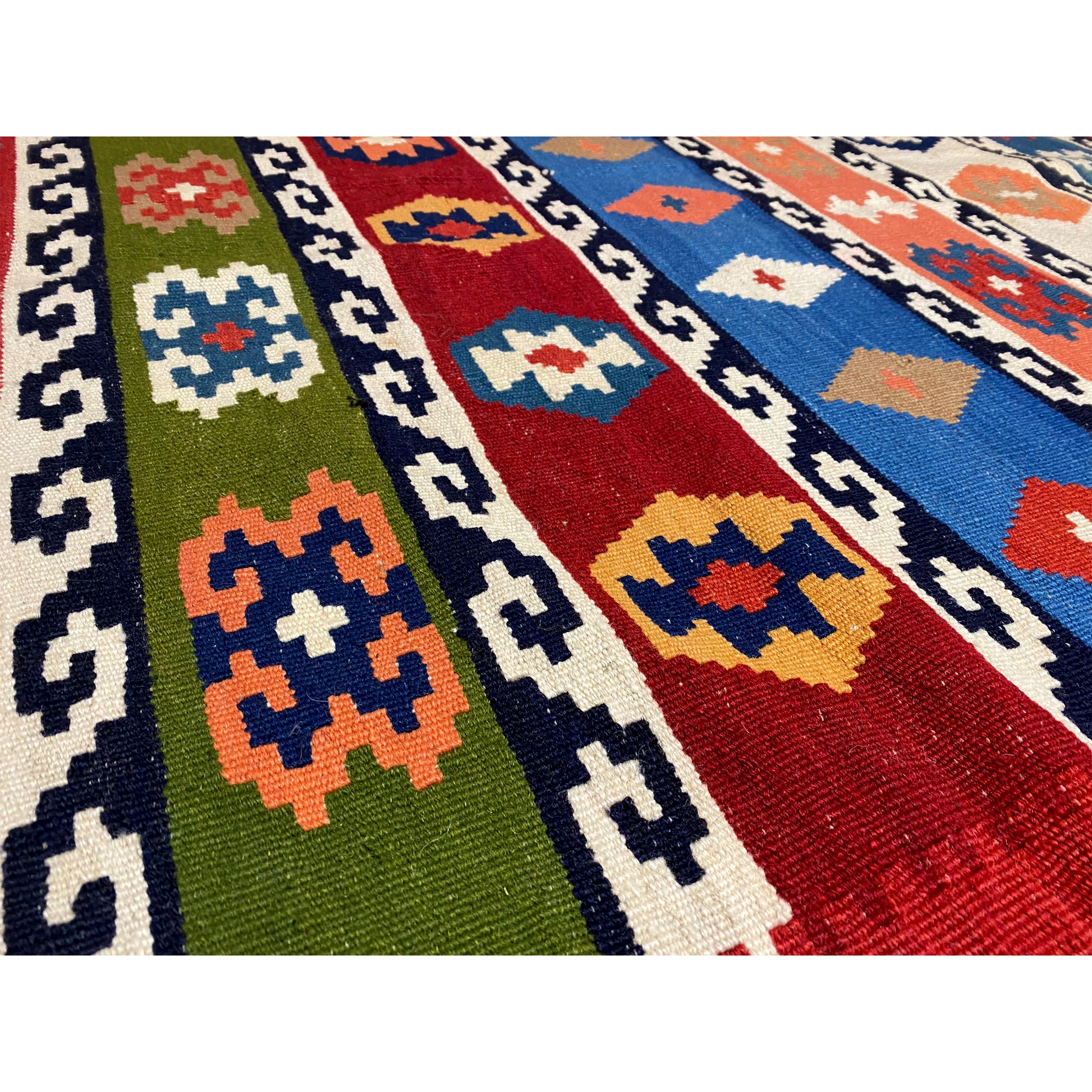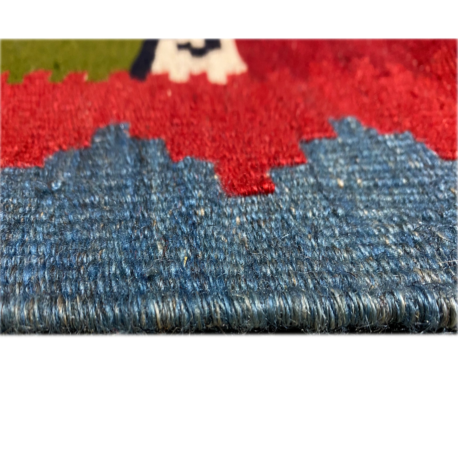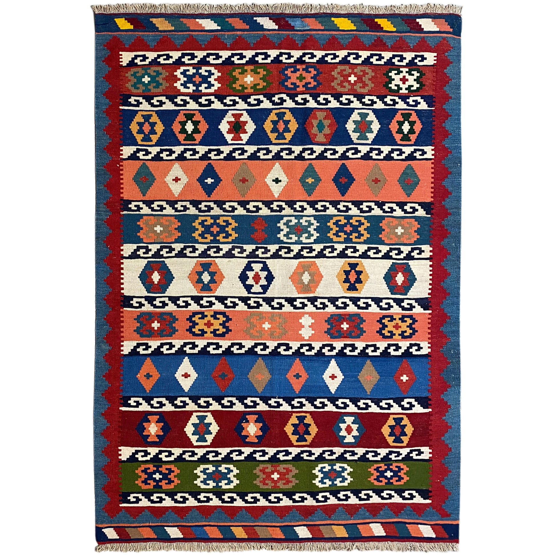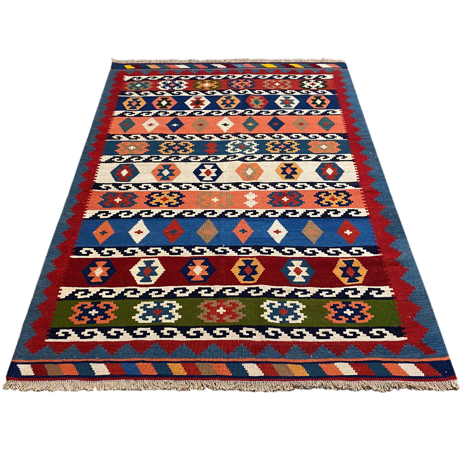 この目を引く手織りのケリム・カシュカイは、手紡ぎの羊毛で作られており、鮮やかで多色使いのデザインが特徴で、青色が支配的でサイズは200x145 cmです。水平の帯が魅力的に配置されており、それぞれに異なる幾何学模様や伝統的なパターンが施されています。トライバル、ボヘミアン、またはエクレクティックなインテリアスタイルに最適で、この耐久性のある平織りのラグは、印象的な見た目だけでなく、純粋な羊毛の自然な手触りと耐久性を提供し、どんな空間にも本物でカラフルな雰囲気を与えます。"}
