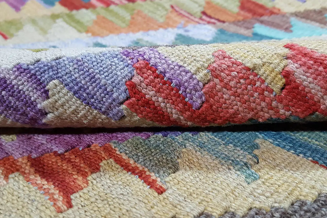 アフガニスタン産のキリムは、その独特の鮮やかな色彩で特に知られています。これは天然の植物染色プロセスによって得られています。この地域のキリムも、他の当社の絨毯と同様に、地域で生産された手紡ぎの羊毛で作られています。天然素材と高品質な仕上げにより、これらの絨毯は特に耐久性があり、丈夫です。