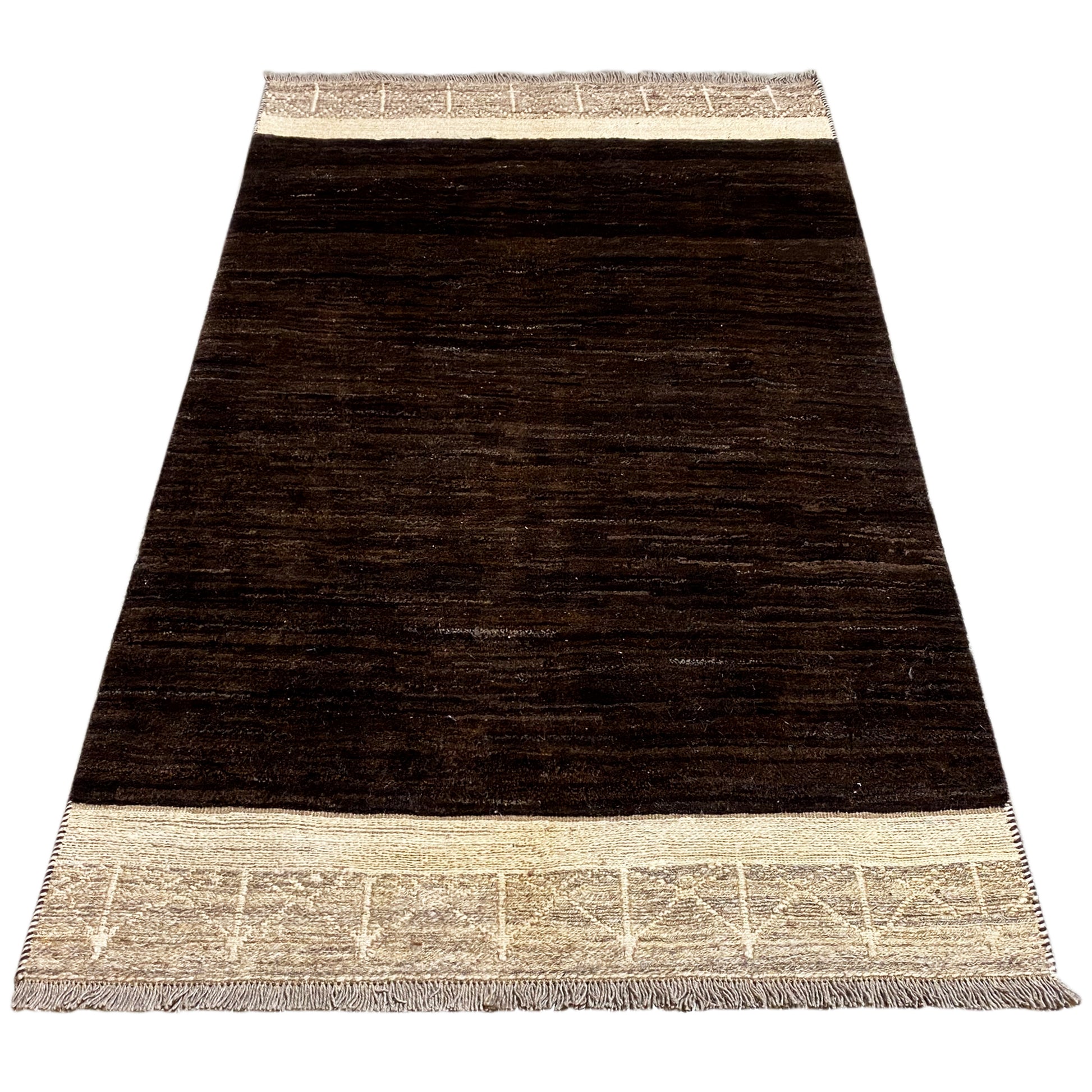手紡ぎで植物染めされた羊毛から作られたこのカーペットは、深いブラウンの落ち着いたブロック模様と控えめな明るいアクセントが特徴です。184×113cmのサイズで、小さな部屋や廊下、またはモダンなリビングスペースのスタイリッシュなアクセントに最適です。
