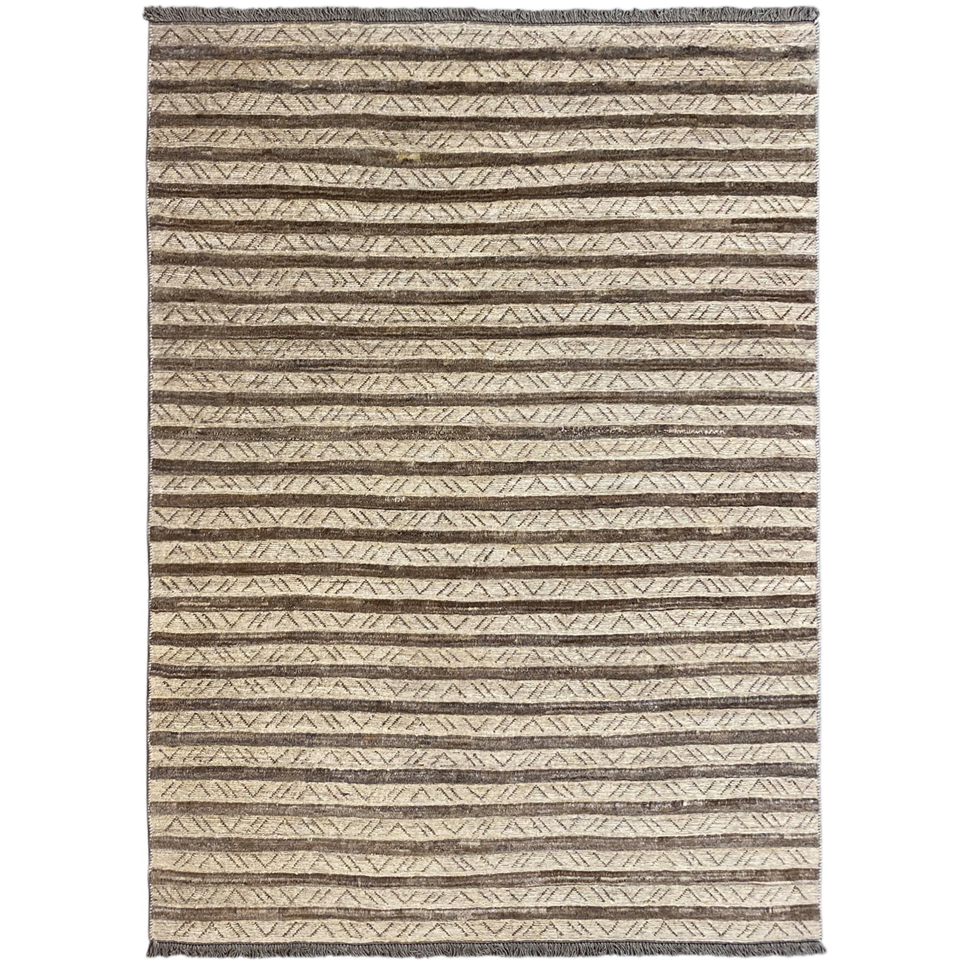 手紡ぎで植物染めされた新毛のウールから作られたこのカーペットは、耐久性のある品質とベージュやブラウンのスタイリッシュなストライプ模様が特徴です。調和のとれた色合いで、多様な組み合わせが可能です – リビングルーム、寝室、玄関などに最適です。