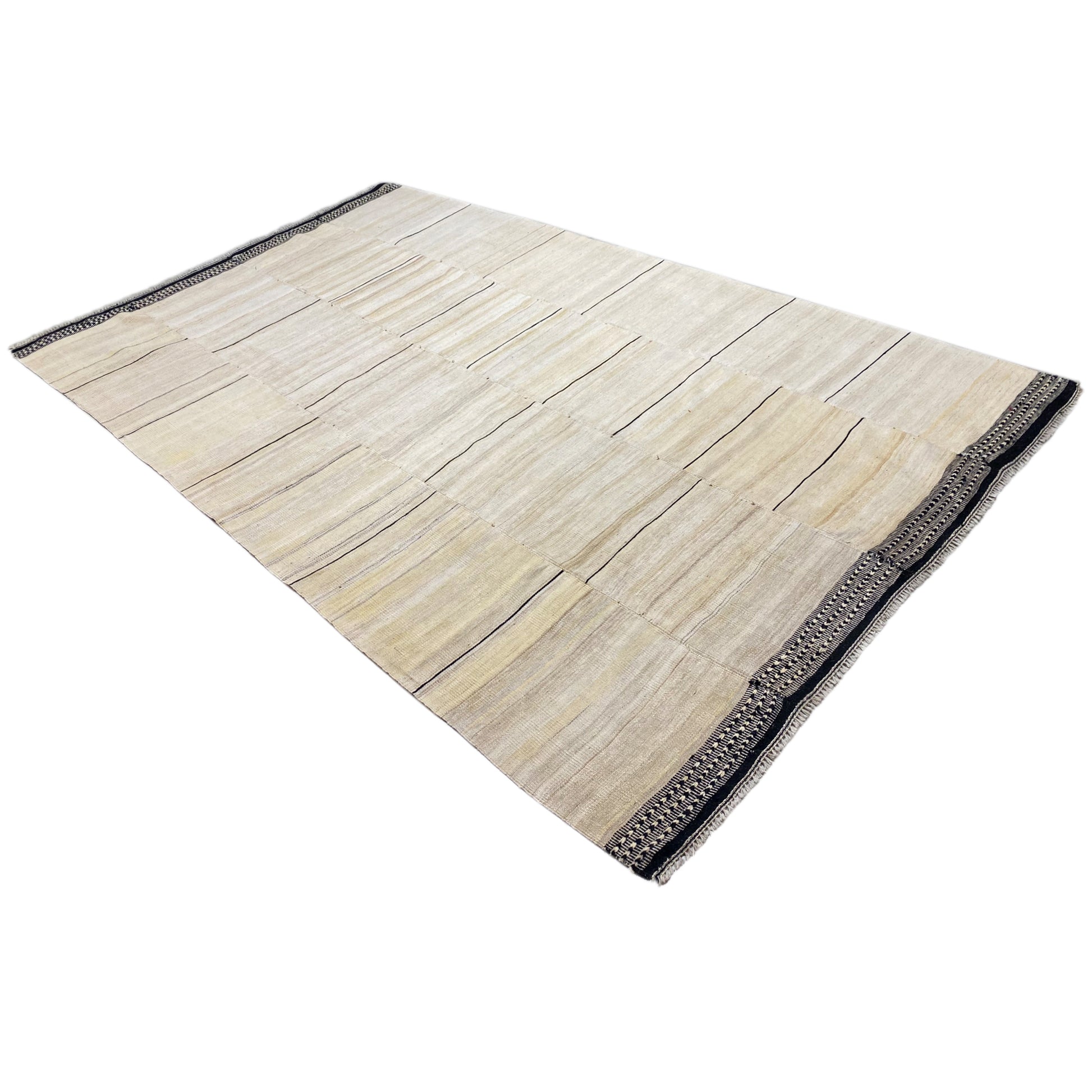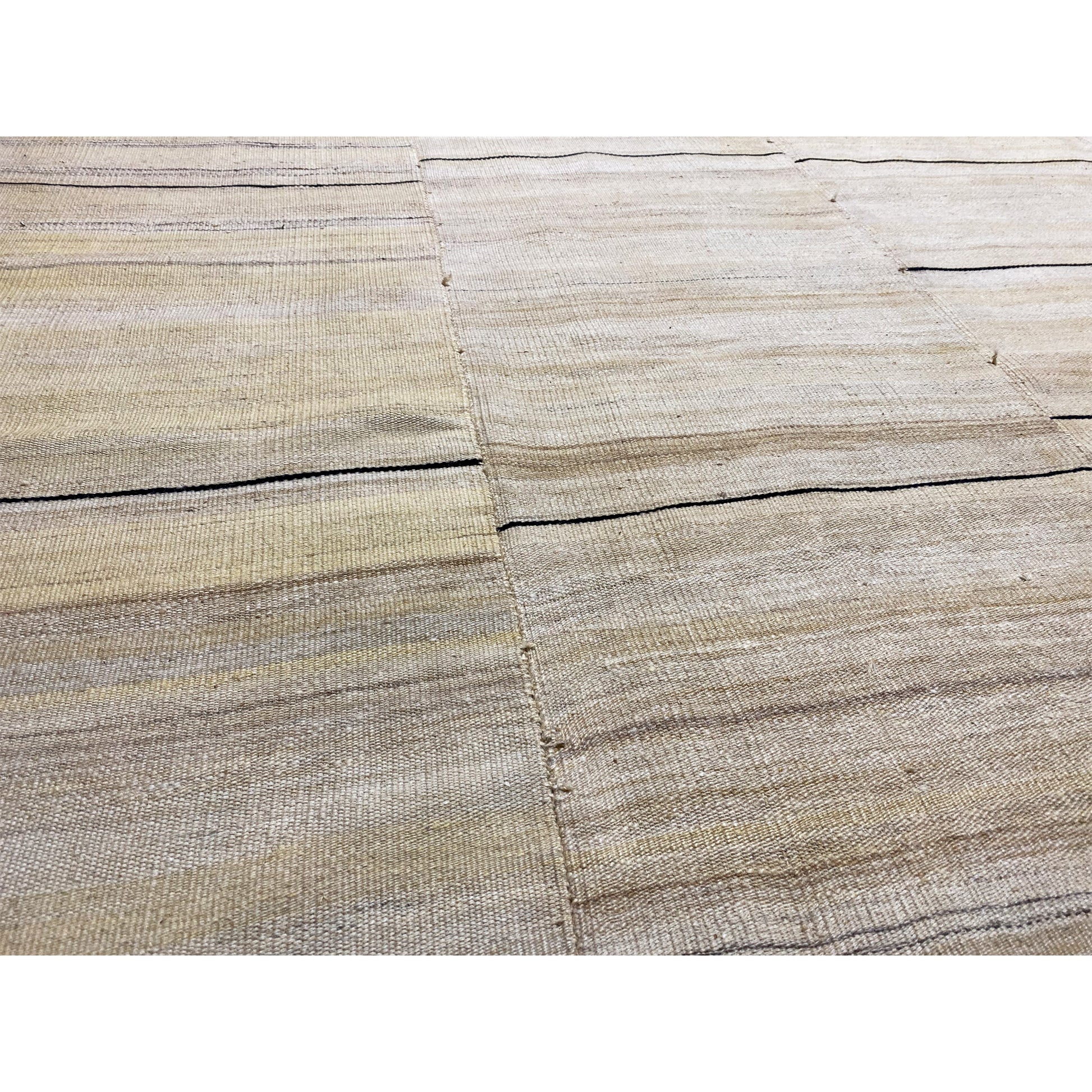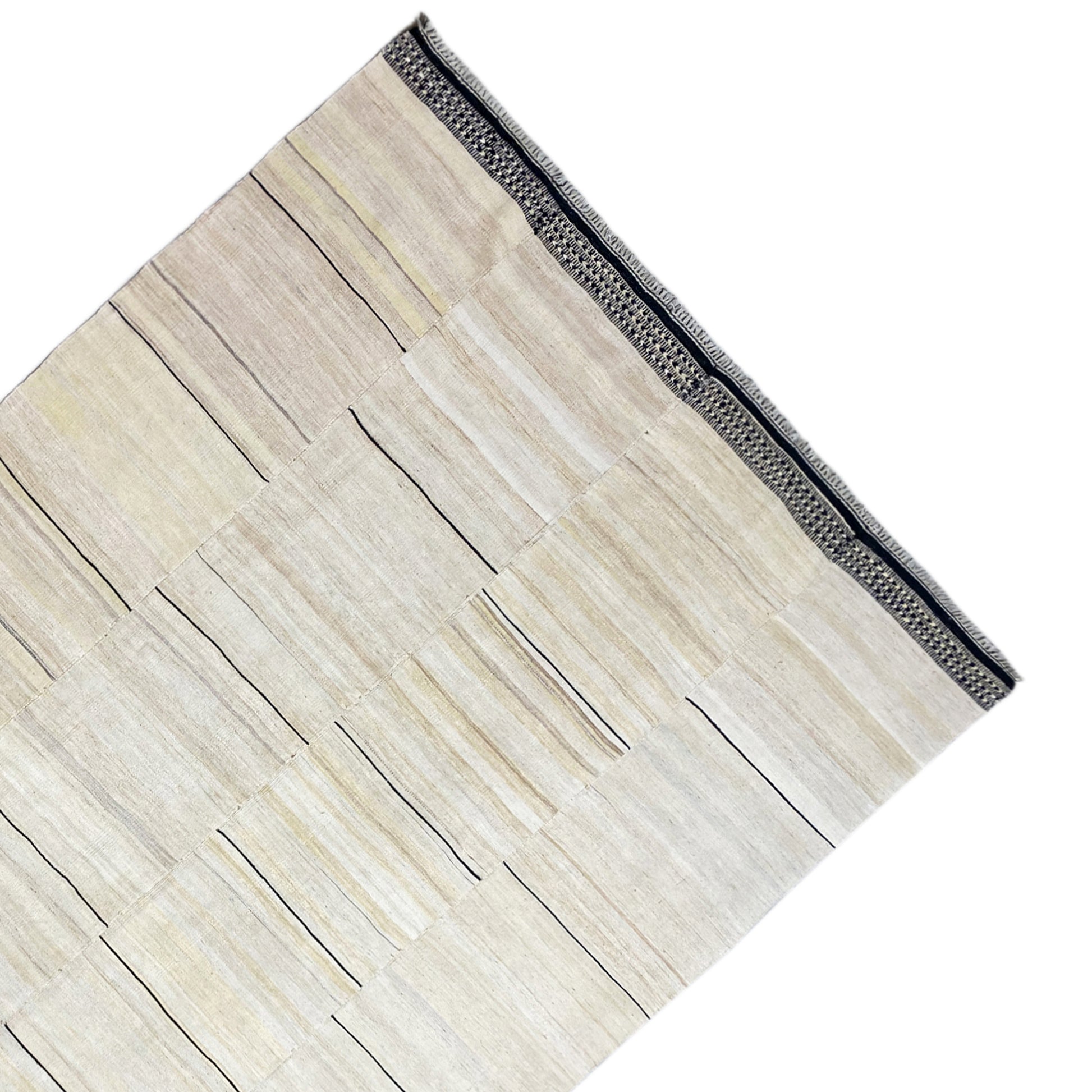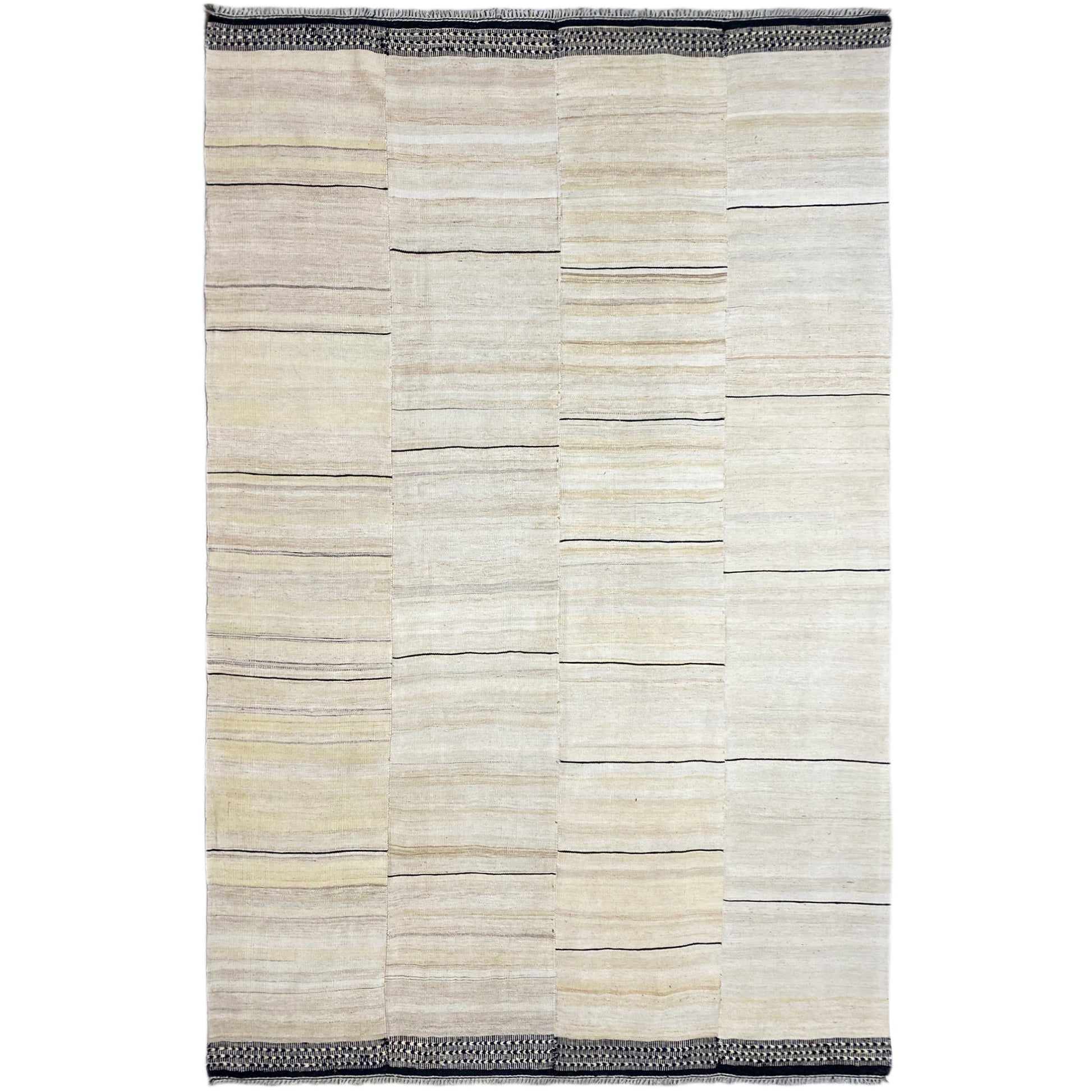 このモダンなフラット織りのケリムは、318x198cmのサイズで、どんなインテリアにもスタイリッシュなアクセントを加えます。高品質なウールとコットンの経糸で作られており、耐久性と心地よい手触りを提供します。ベージュとダークブルーの独特なストライプ模様は、モダンまたはミニマリストなインテリアスタイルに完璧にマッチし、落ち着きながらも印象的な雰囲気を作り出します。どの部屋にも現代的なエレガンスをもたらすのに理想的です。