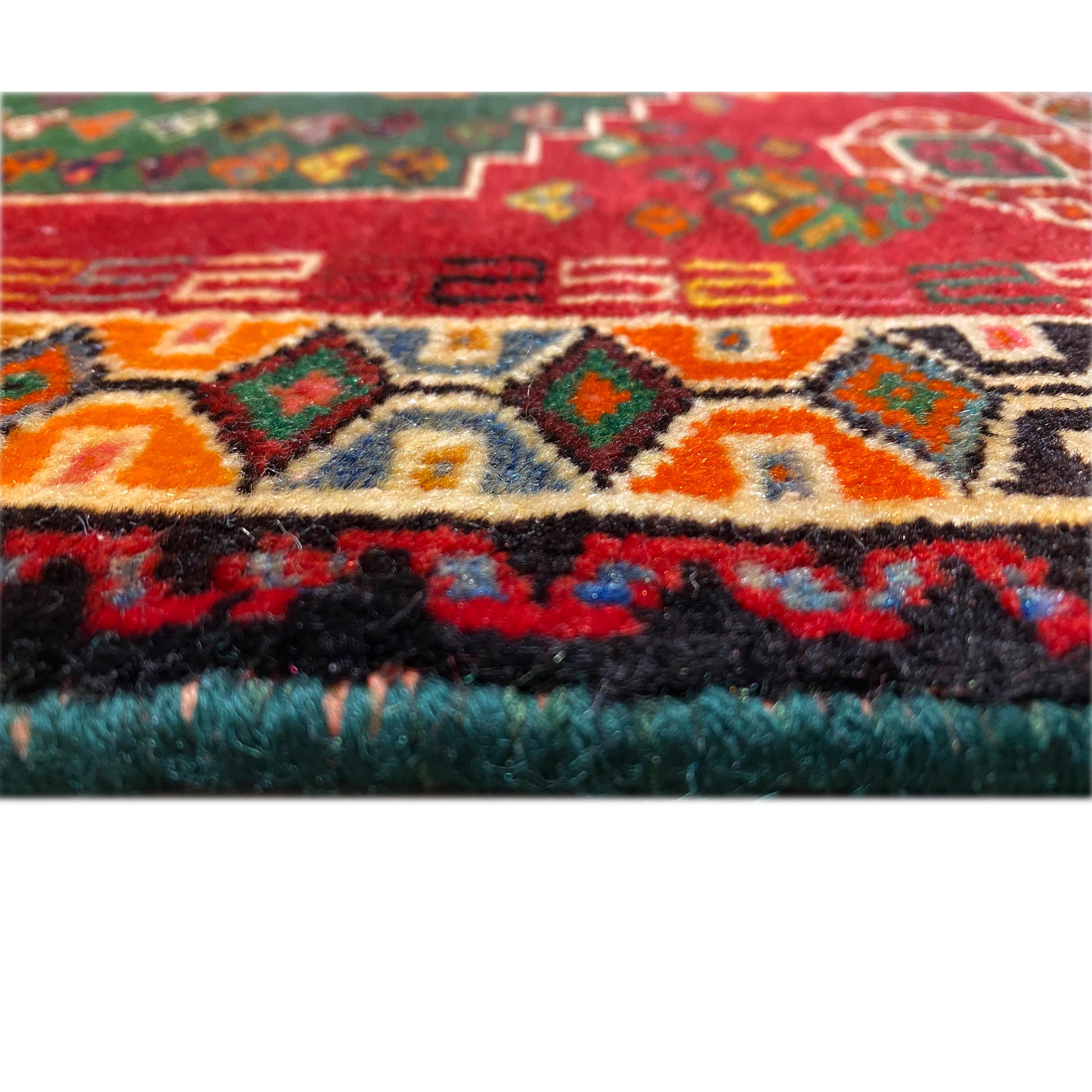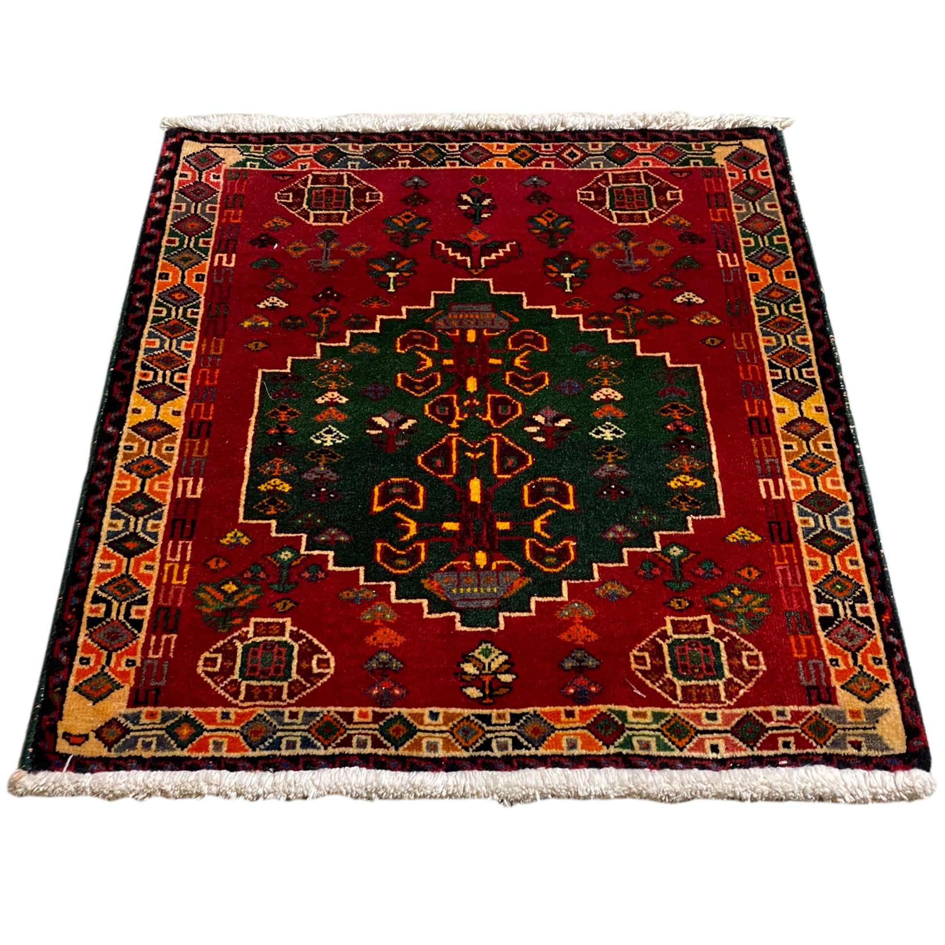 この魅力的な手織りのポシュティ絨毯は、鮮やかな赤色に際立つ緑色の中央メダリオンが特徴で、遊牧民の織物技術の証です。これらの特別な「トルキー」絨毯は、南イランの「トルク」部族グループに由来します。高品質のウールと綿の経糸で作られ、サイズは62x61cmで、この作品はどの部屋にも本格的で伝統的な雰囲気を与えます。その独特な幾何学模様と頑丈な手工芸の組み合わせにより、文化と快適さを融合させた耐久性と美的魅力を兼ね備えた注目の一品となっています。