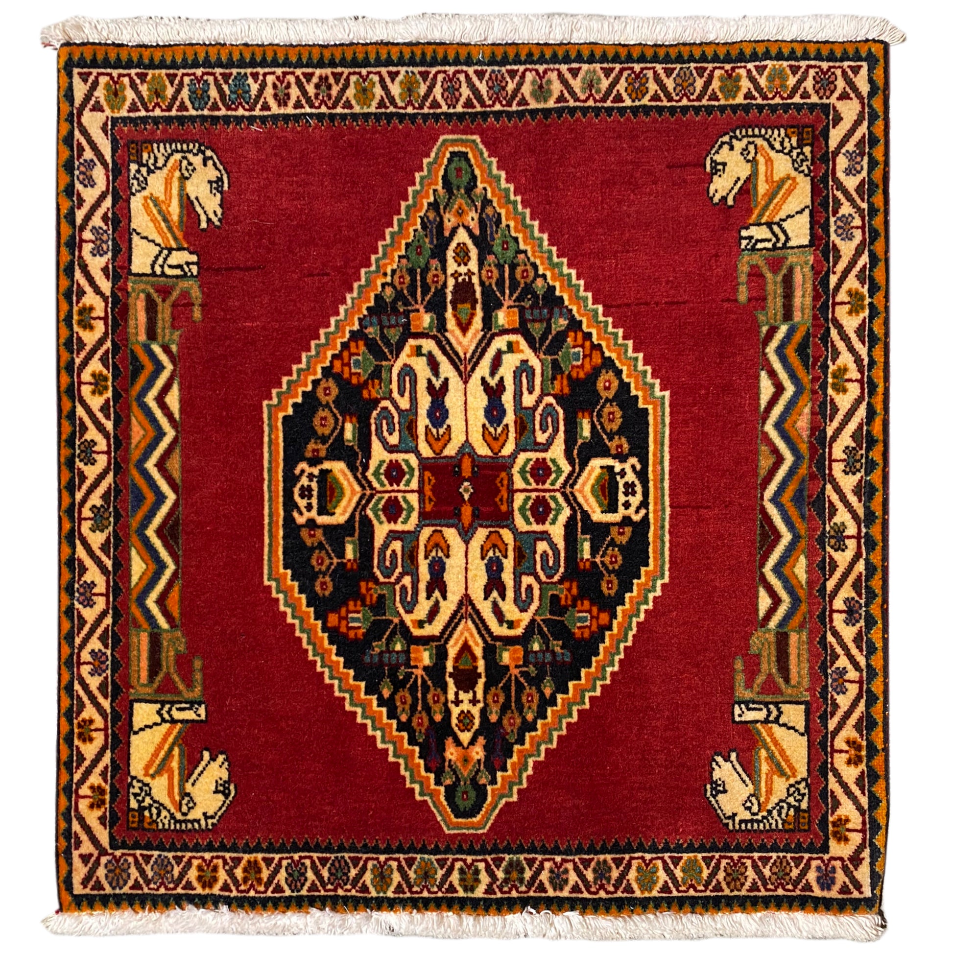 この精巧な手織りのポシュティ絨毯は、南イランの「トルク」部族グループの本物の傑作で、「トルキー」として親しまれています。64x62 cmのサイズを持つこの独特なウールと綿の作品は、鮮やかな赤い地色が特徴で、細部まで緻密な中央の菱形メダリオンを囲んでいます。特に目を引くのは、側面の柱に描かれた様式化された動物の図柄で、この絨毯に独特の個性を与えています。伝統的なインテリアに最適で、その鮮やかな色彩と深く根付いた文化があらゆる空間を豊かに彩ります。
