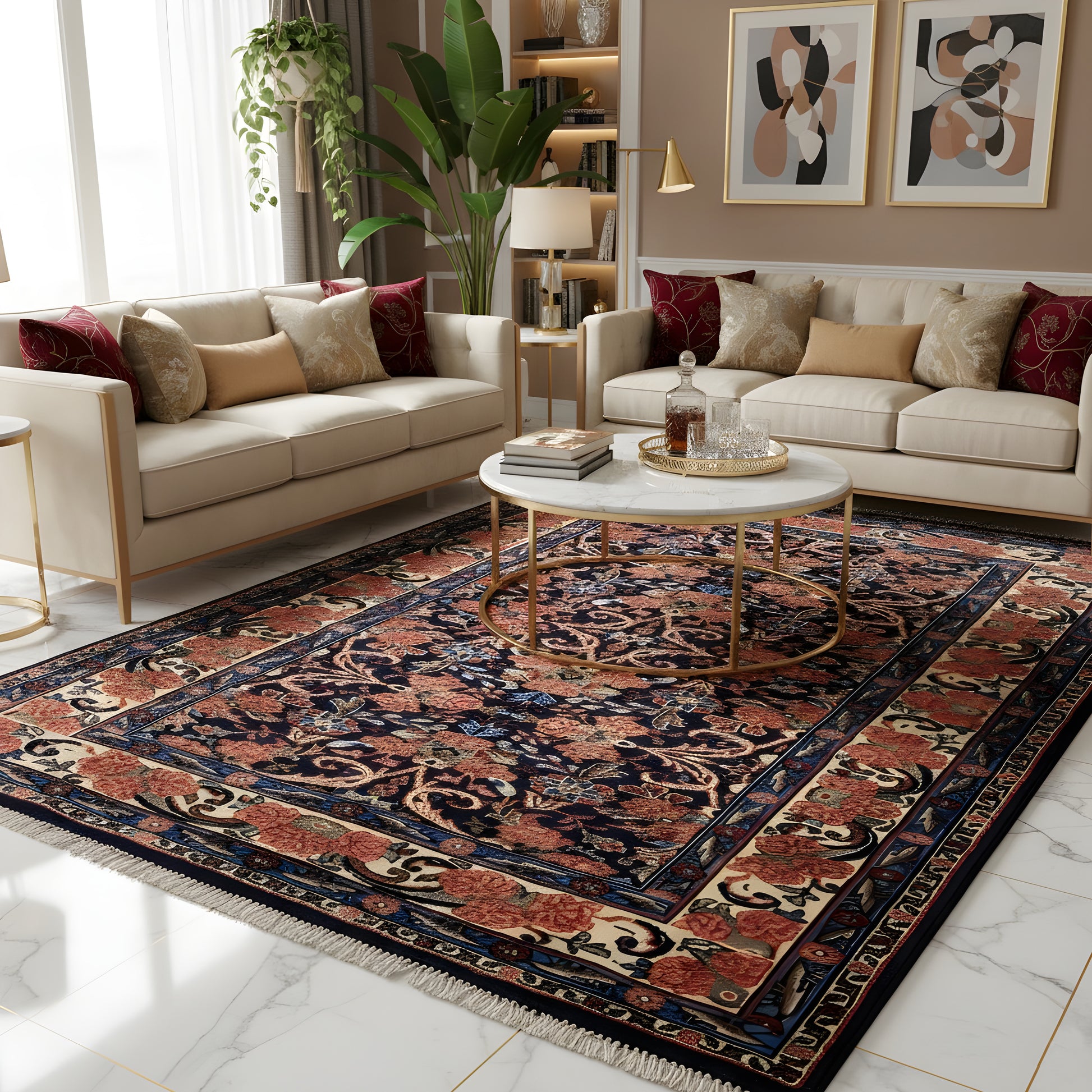 Dieser handgeknüpfte Hamedan Teppich aus handgesponnener Wolle vereint traditionelle persische Handwerkskunst mit einem eleganten floralen Muster und setzt in klassischen wie modernen Wohnräumen stilvolle Akzente; das kompakte Format von 142x102 cm passt ideal in Wohnzimmer, Flur oder Schlafzimmer, während die dunkle Blaugrundfarbe mit warmen Rot- und Beigetönen dem Raum Tiefe, Wärme und Charakter verleiht – ein langlebiger, hochwertiger Teppich, der durch seine robuste Knotendichte von 160.000 Knoten/qm, zeitlose Optik und vielseitige Einsatzmöglichkeiten überzeugt.