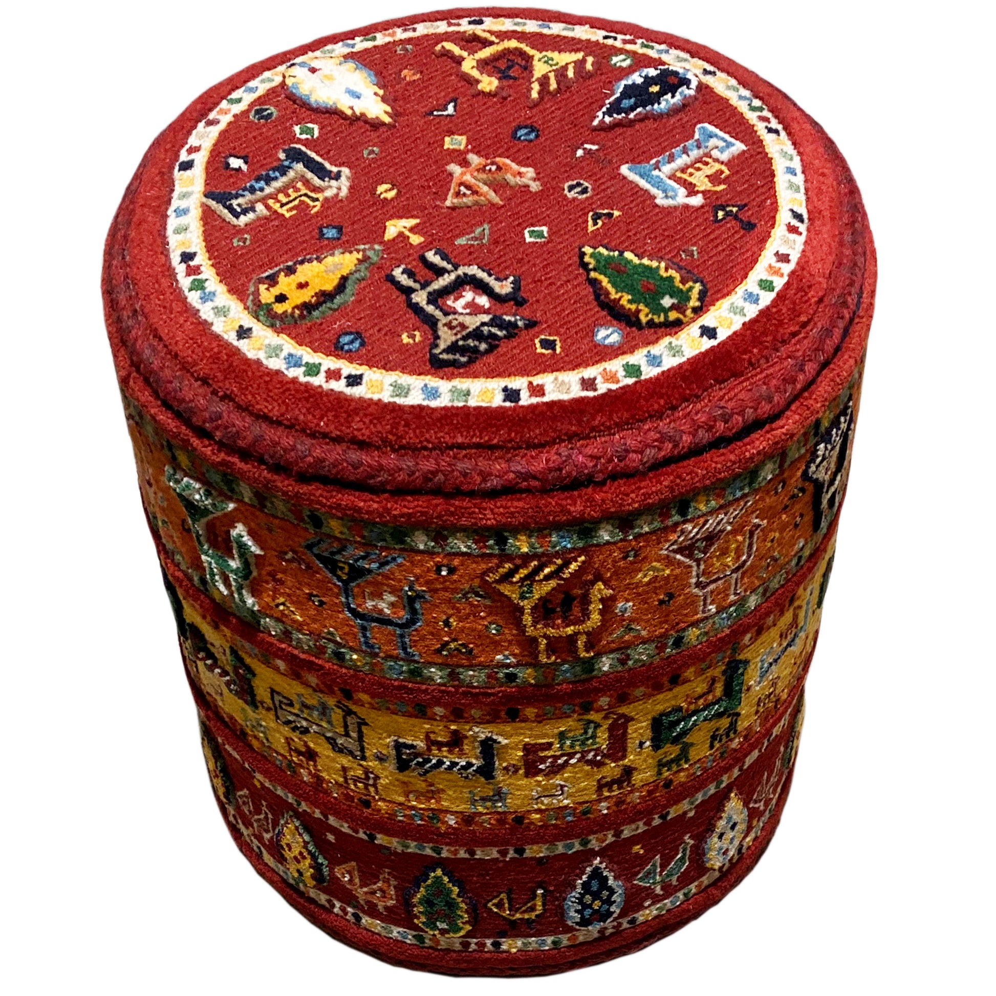 この精巧なスーマックのスツールでお部屋を豊かに彩りましょう。手紡ぎの植物染めウールから丁寧に作られています。鮮やかな赤いベースカラーと複雑な幾何学模様やトライバル風のデザインは、豊かな伝統的なインテリアスタイルを反映しています。サイズは40x40x50cmで、この魅力的で耐久性のあるスツールは、追加の座席や装飾的なアクセントとして多用途に使え、どんなリビング空間にも独特の職人技と快適さをもたらします。